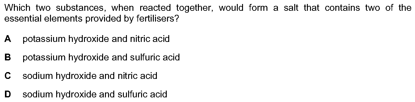 Fertilisers are used to provide three elements needed to increase the yield of crops.Which two compounds, when used together, would provide all three ...