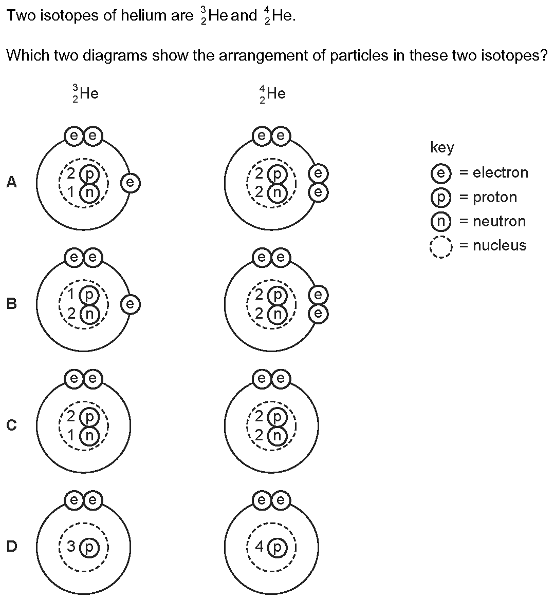 The diagrams show four particles. Key: e = an electron n = a neutron p = a proton [Dashed circle] = nucleus Which two diagrams show atoms that a...