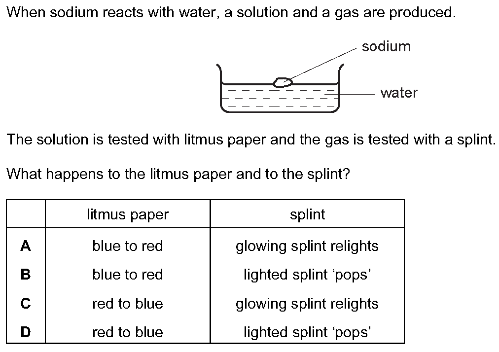 A student added dilute hydrochloric acid to four metals and recorded the results. Not all of the results are correct. [Table_1] Which two results ar...
