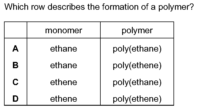 A macromolecule is a very large molecule.Macromolecules can be made by joining smaller molecules together. This is called polymerisation.Which row in ...