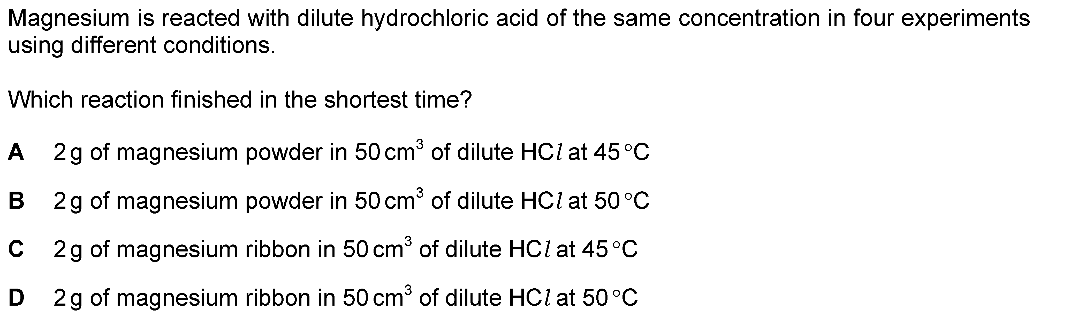 A student investigates the rate of reaction between magnesium and excess sulfuric acid. The volume of hydrogen given off in the reaction is measured o...