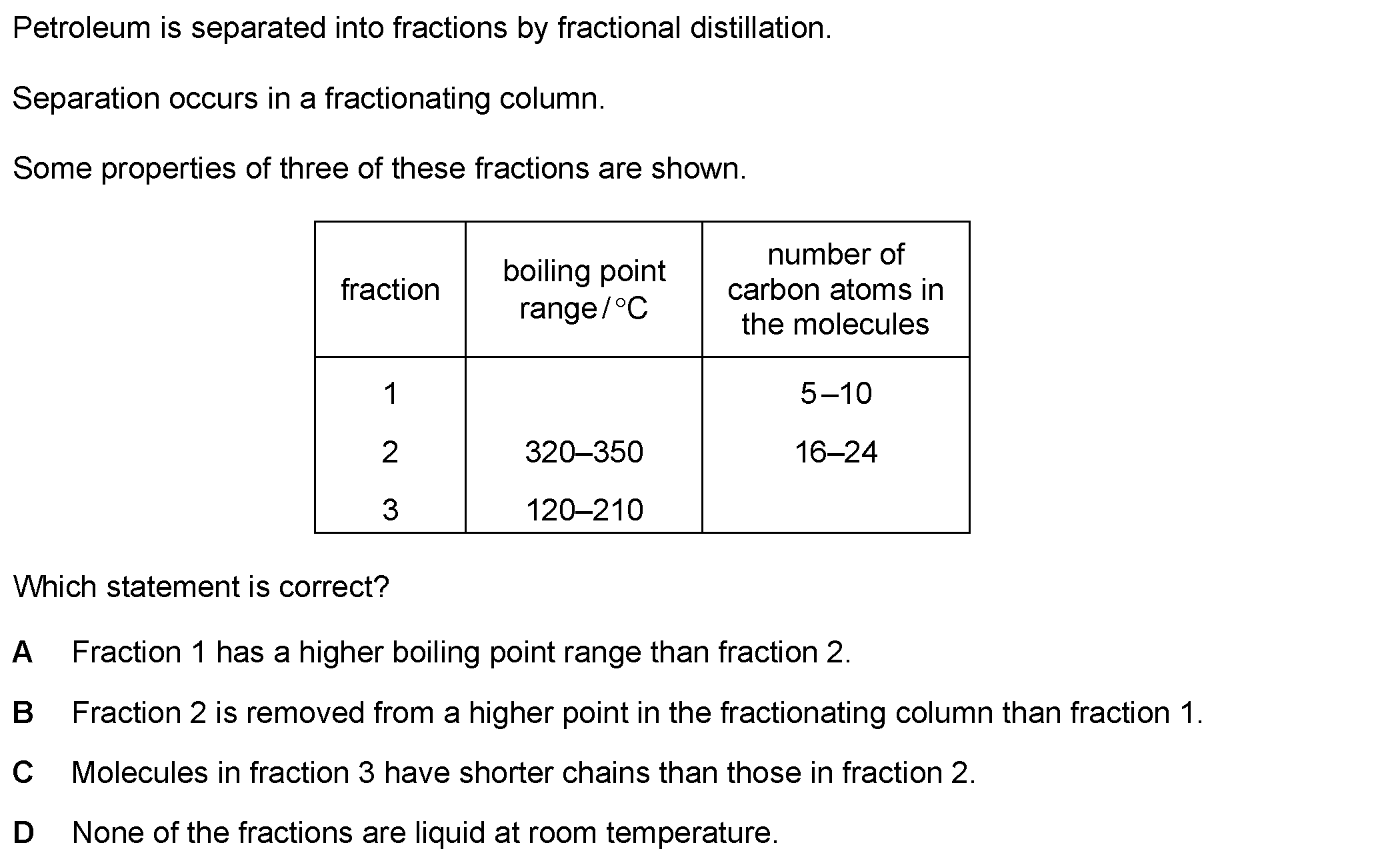 The diagram shows apparatus used to separate petroleum into four fractions. Which fraction contains the smallest hydrocarbon molecules? [Table_1]