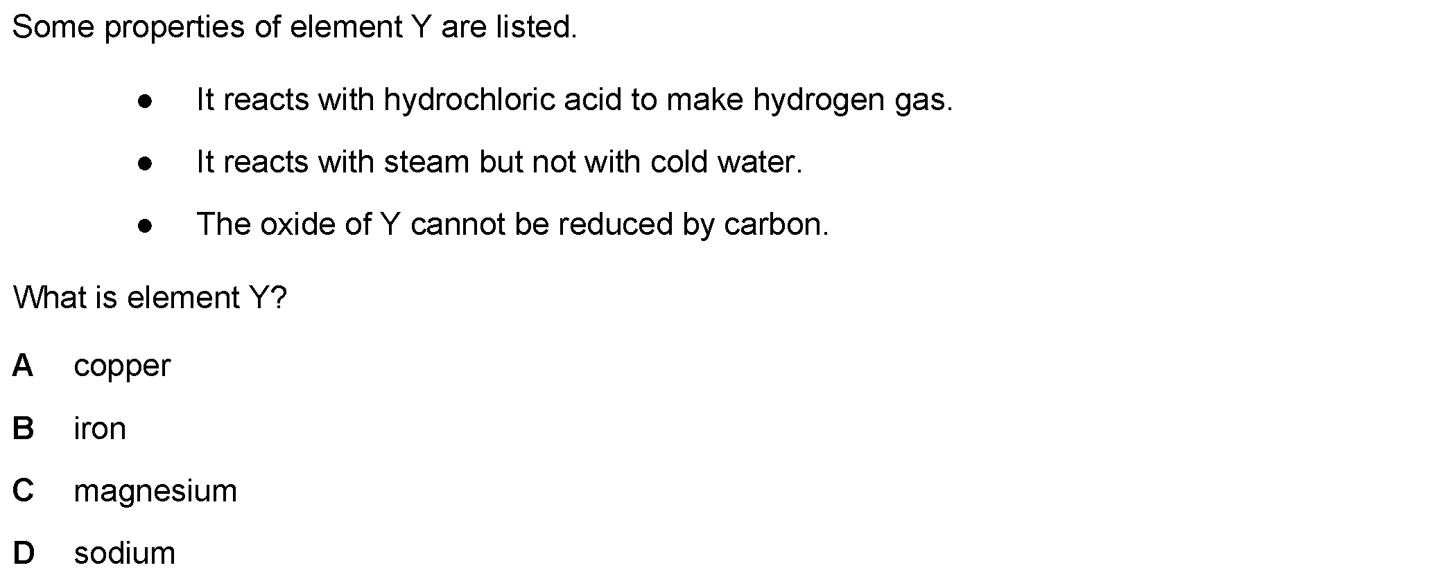 A student added dilute hydrochloric acid to four metals and recorded the results. Not all of the results are correct. [Table_1] Which two results ar...