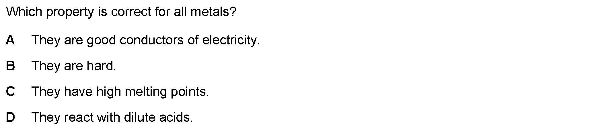 A student added dilute hydrochloric acid to four metals and recorded the results. Not all of the results are correct. [Table_1] Which two results ar...