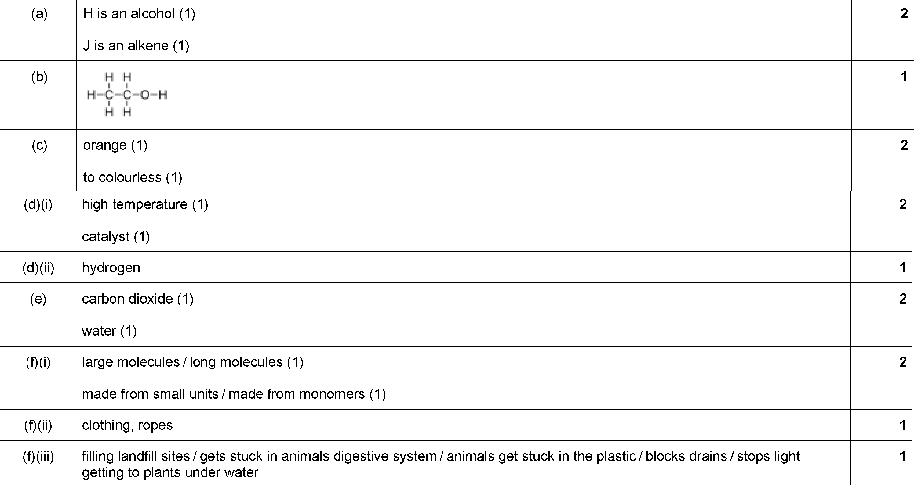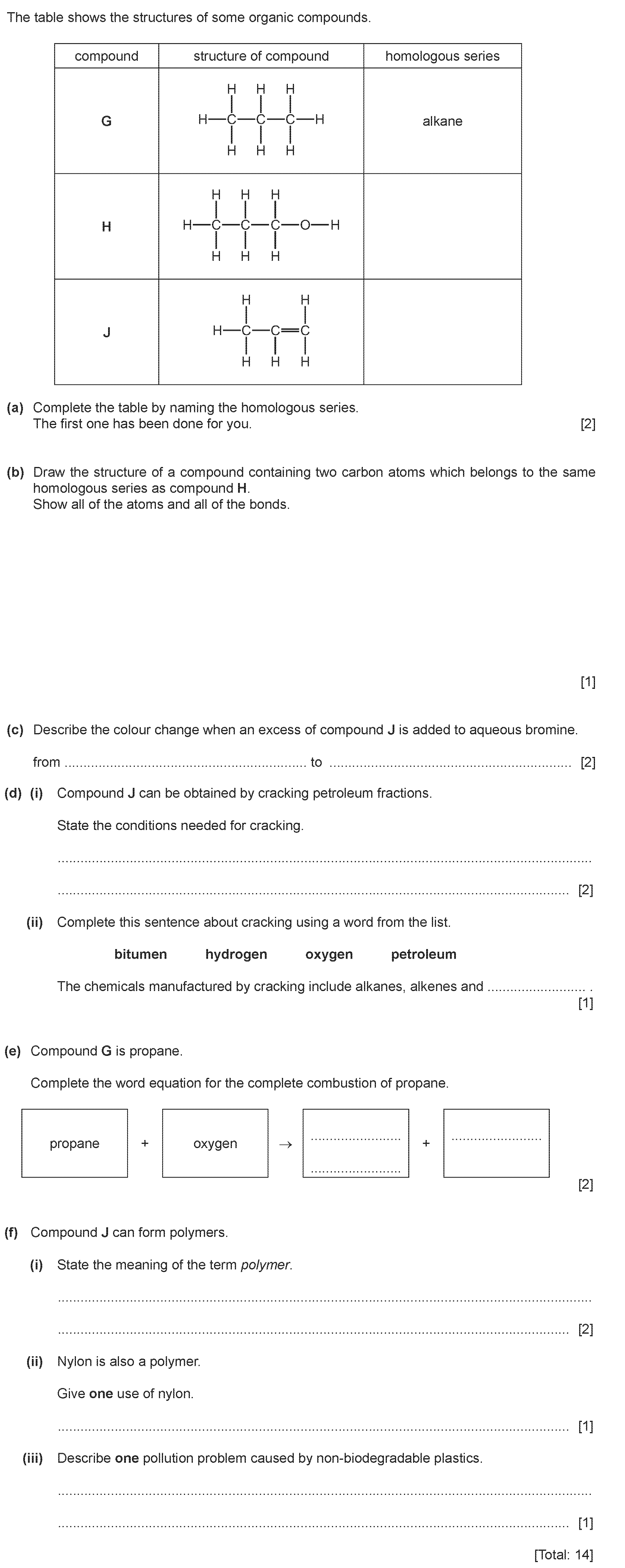 A compound has the formula $\text{CH}_3\text{CH}_2\text{CH} = \text{CH}_2$.Which row in the table shows the type of compound and the colour change whe...