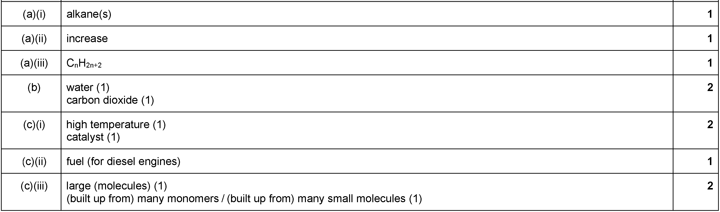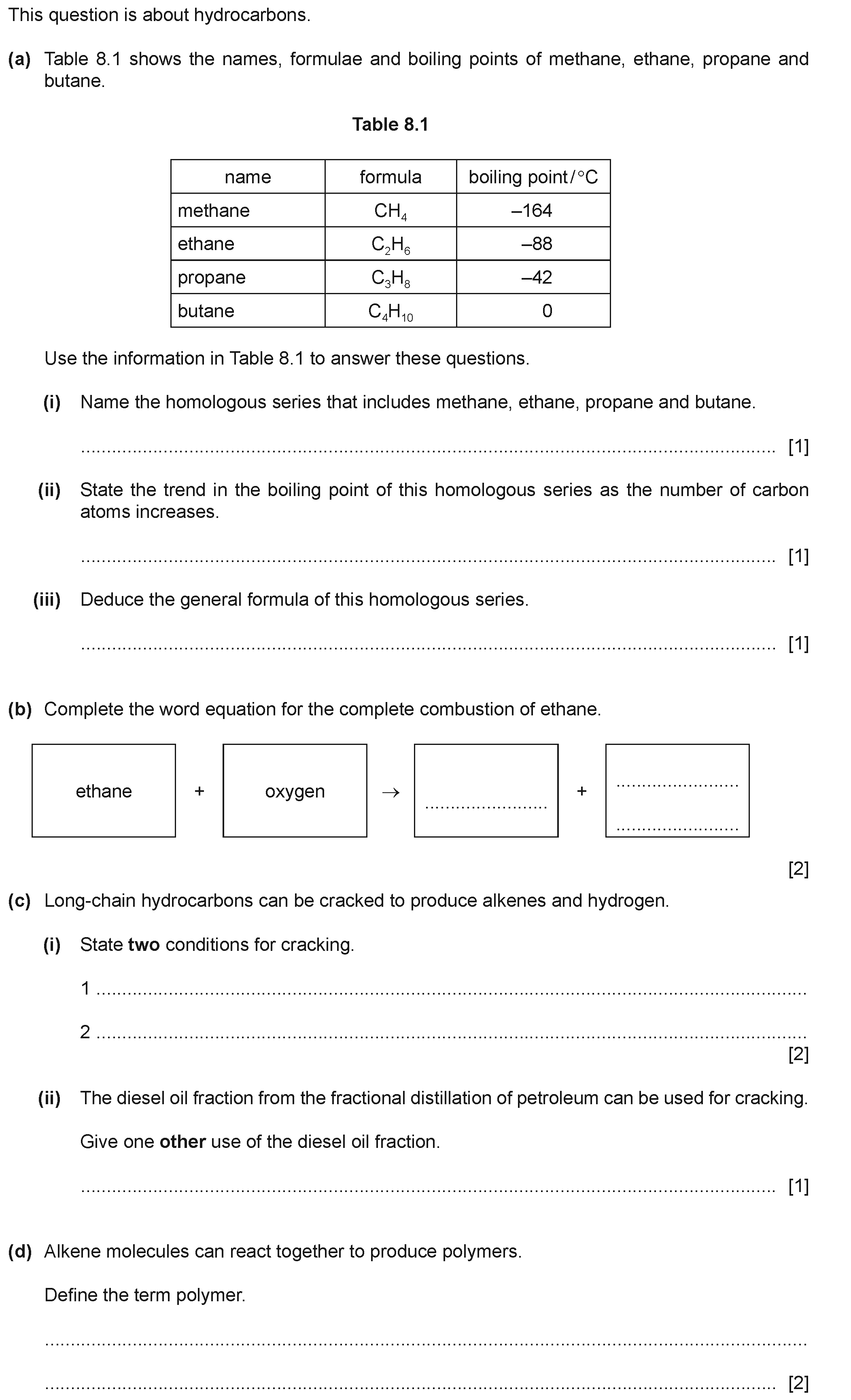 4 Alkenes are a homologous series of hydrocarbons which are made by cracking larger alkane molecules.(a)(i) Write the general formula for alkenes.(ii)...