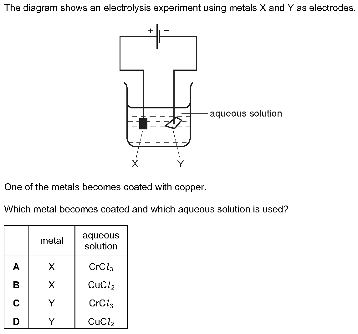 A student sets up a number of simple cells by putting strips of two different metals into dilute sulfuric acid. Which cell produces the highest voltag...