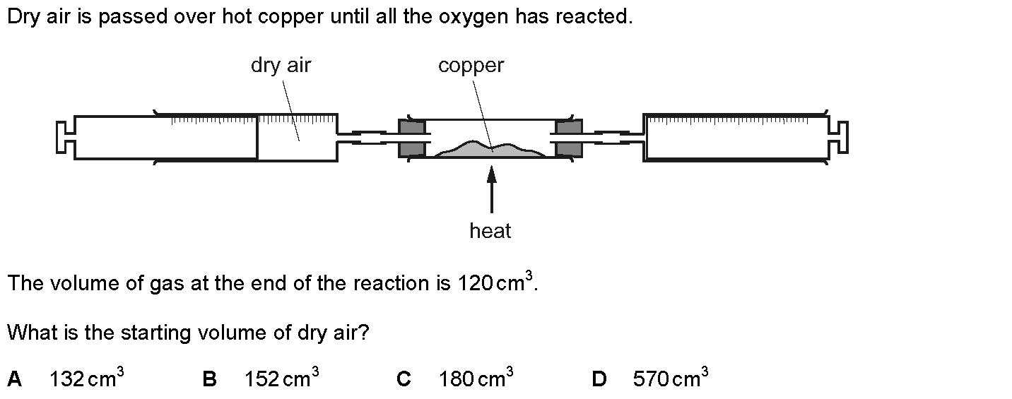 The equation for the combustion of ethane is shown.$2C_2H_6 + 7O_2 \rightarrow 4CO_2 + 6H_2O$Which volume of carbon dioxide, at room temperature and p...