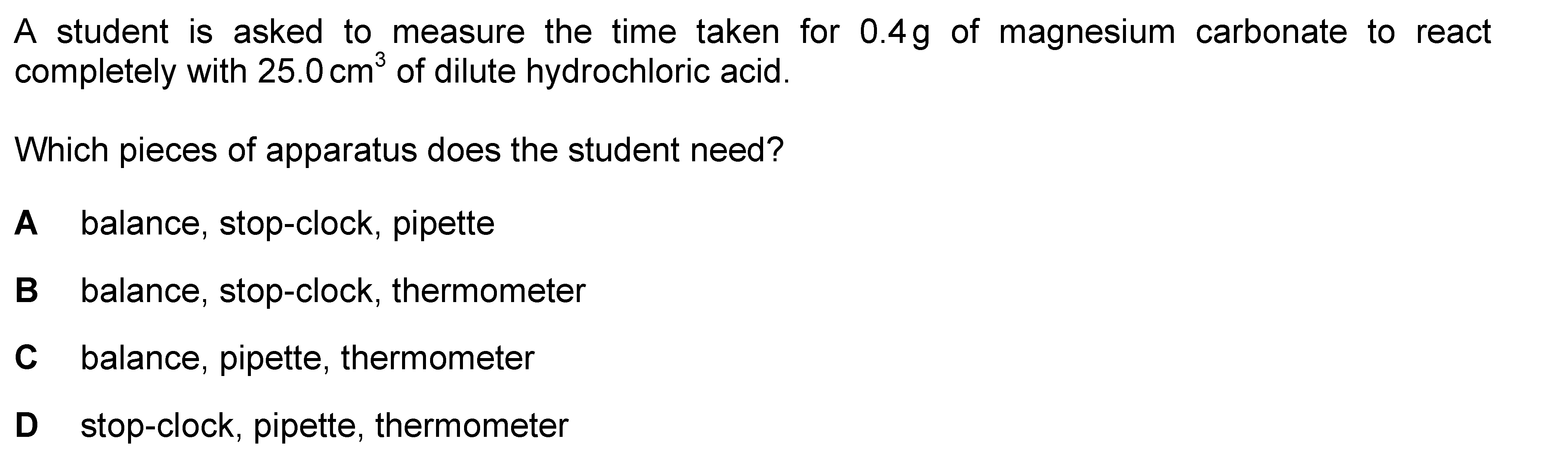2.00 g of powdered calcium carbonate is added to 50.0 cm$^3$ of hydrochloric acid. Which apparatus is used to measure the calcium carbonate and the h...