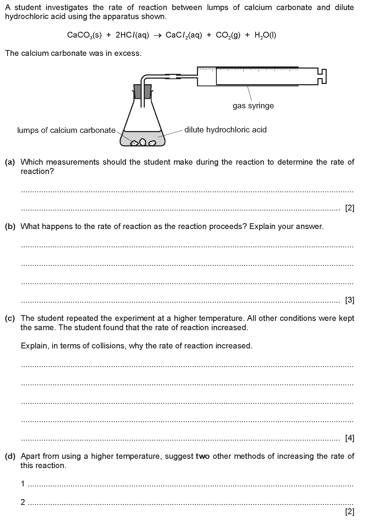 A student was investigating the reaction between marble chips and dilute hydrochloric acid. [Image_1: Apparatus setup with a gas syringe, bung, marble...