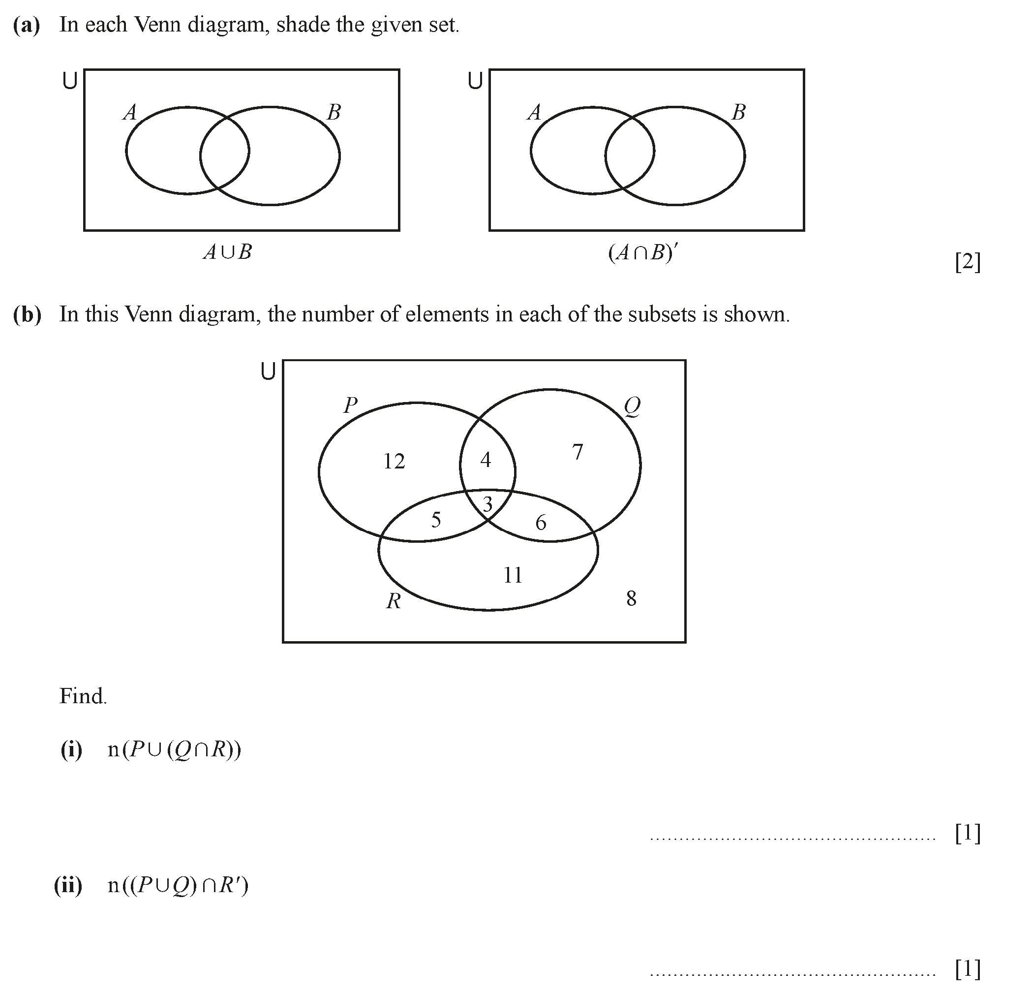 (a) Show that $n(P \cap Q) = 8$. [2](b) An element is chosen at random from $U$.Find the probability that the element is a member of(i) $P \cup Q$. .....