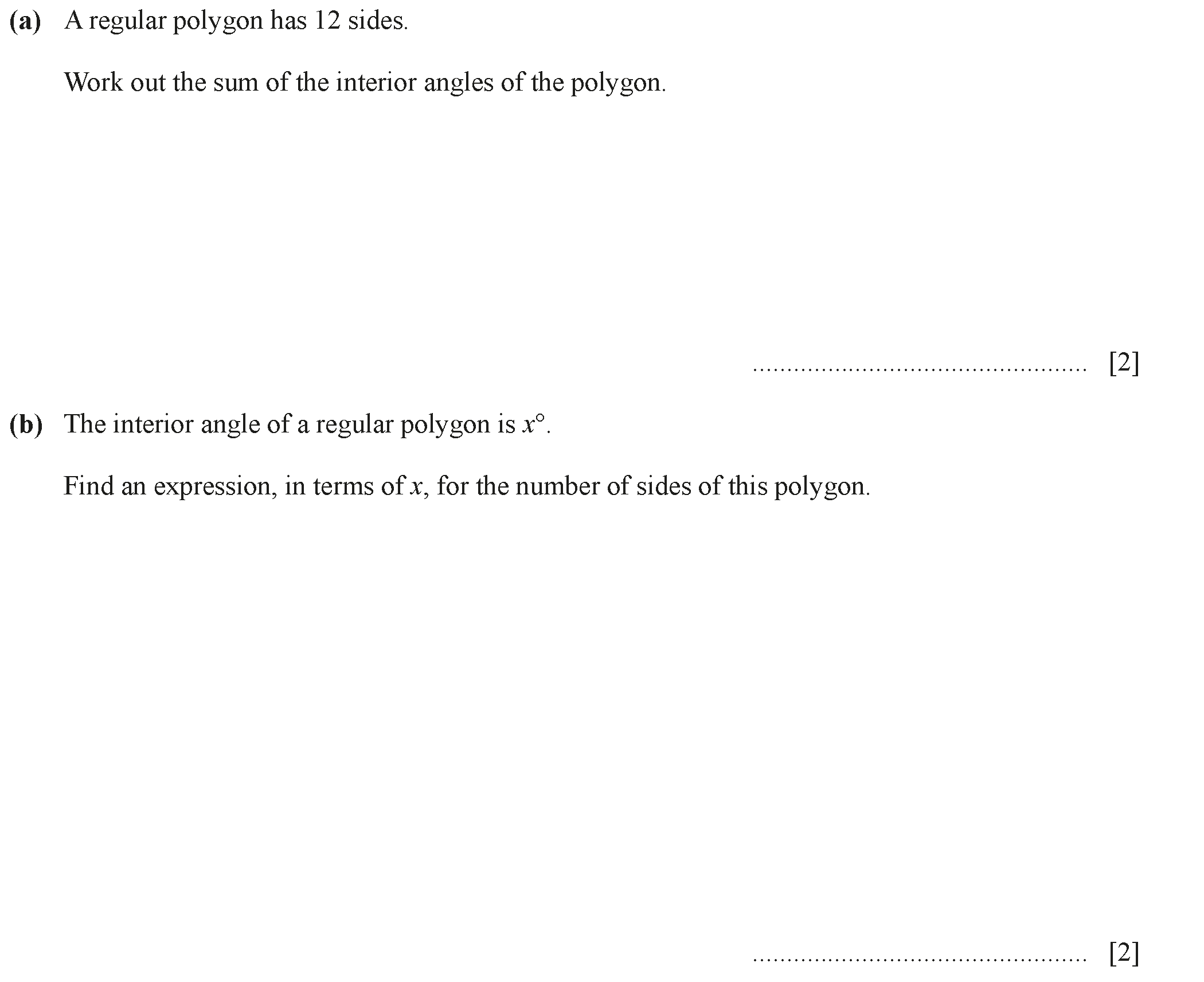(a) A regular polygon has 12 sides. Work out the sum of the interior angles of the polygon. .............................................................