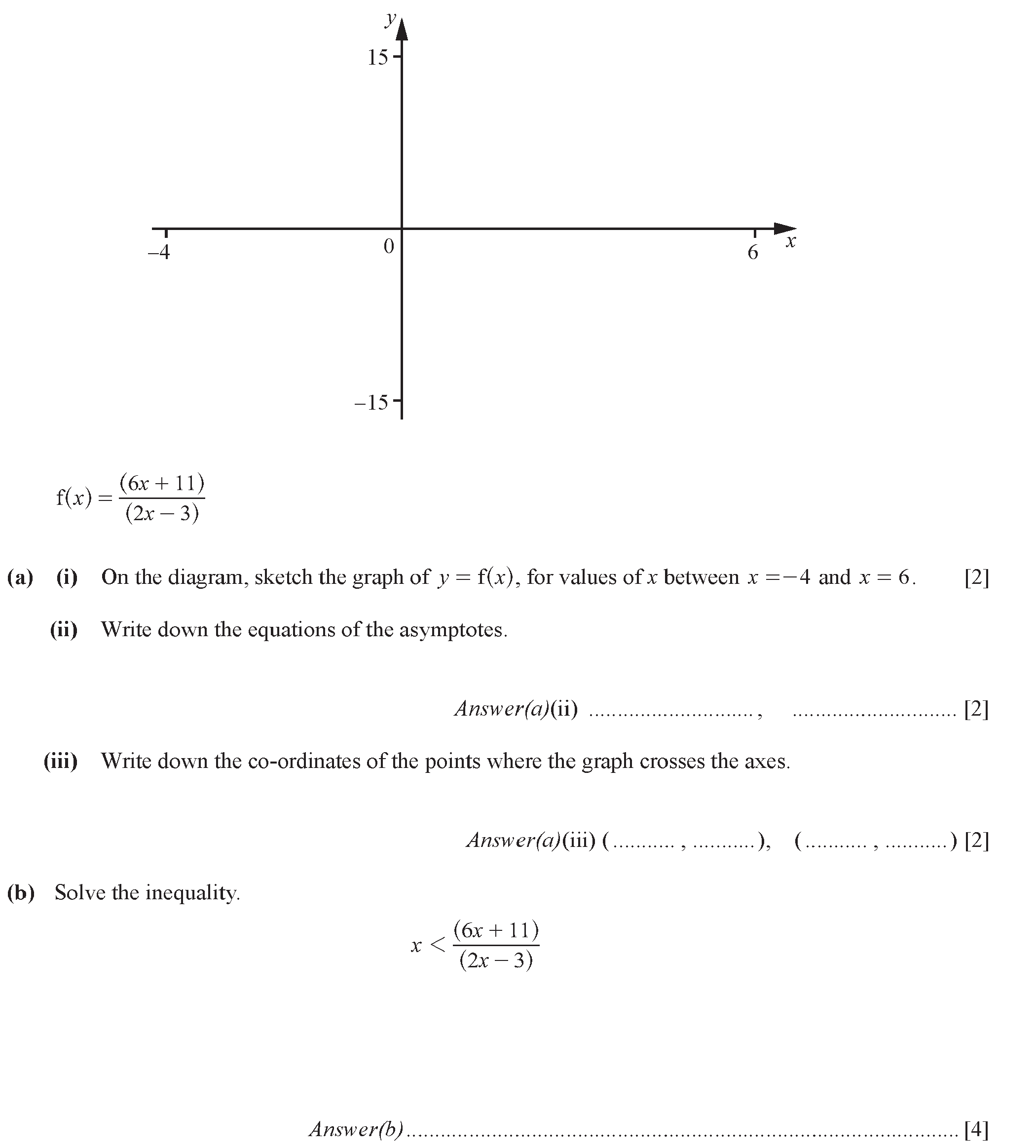 (a) On the diagram, sketch the graph of $y = f(x)$ for values of $x$ between $-6$ and $6$. [3](b) Write down the equations of the asymptotes of the gr...