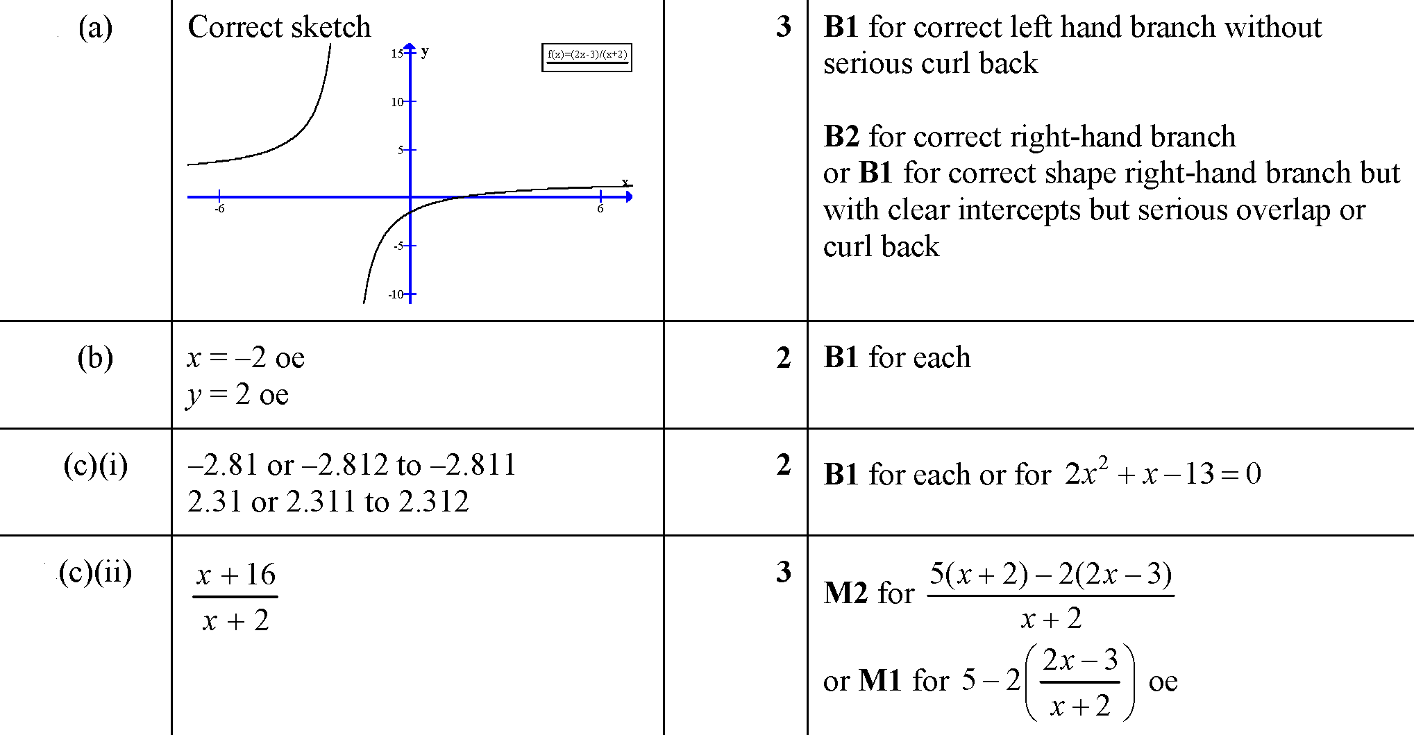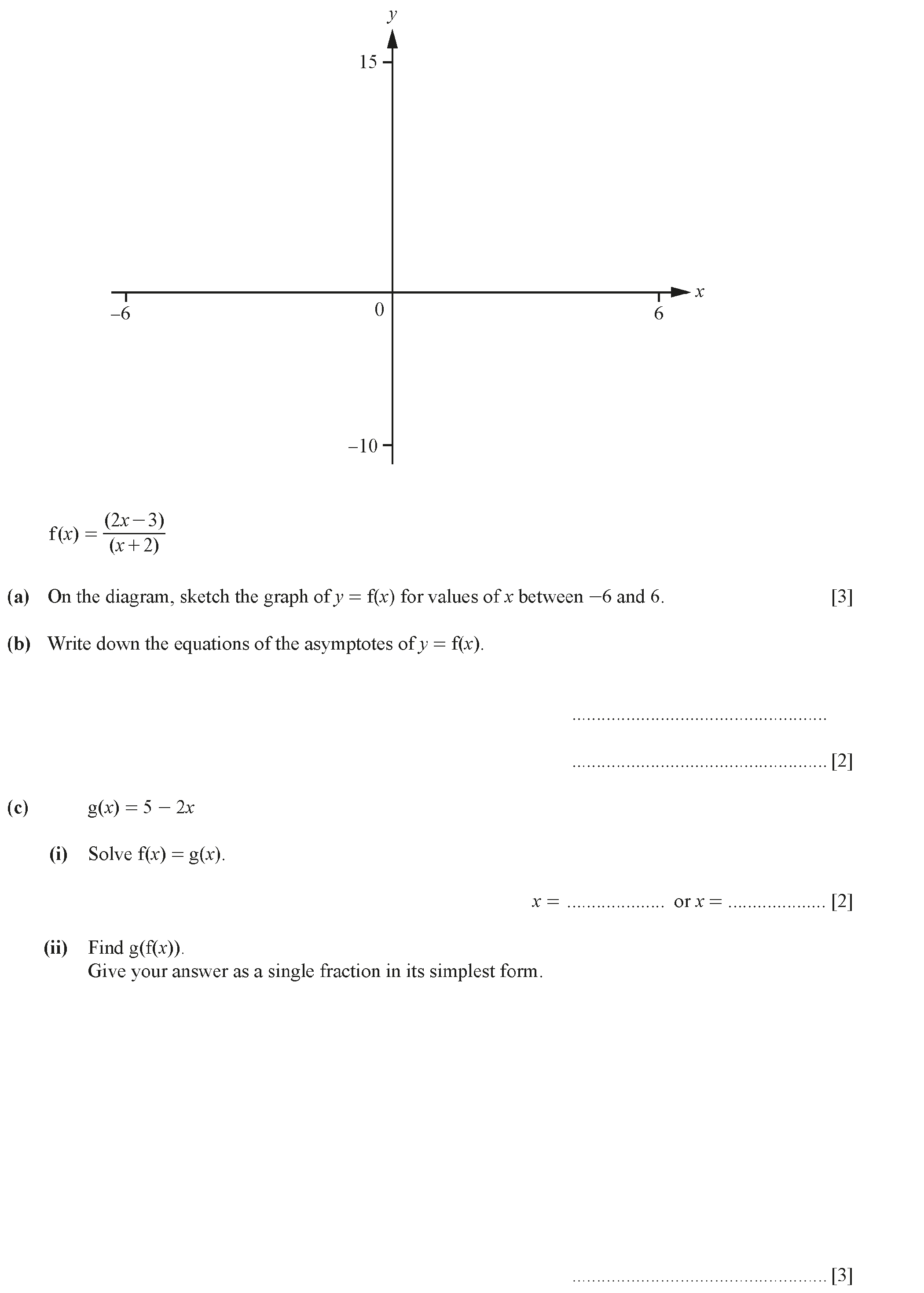 (a) On the diagram, sketch the graph of $y = f(x)$ for values of $x$ between $-6$ and $6$. [3](b) Write down the equations of the asymptotes of the gr...
