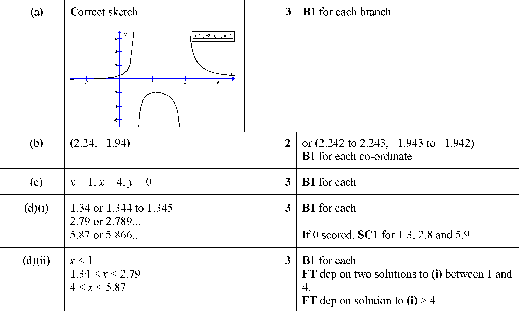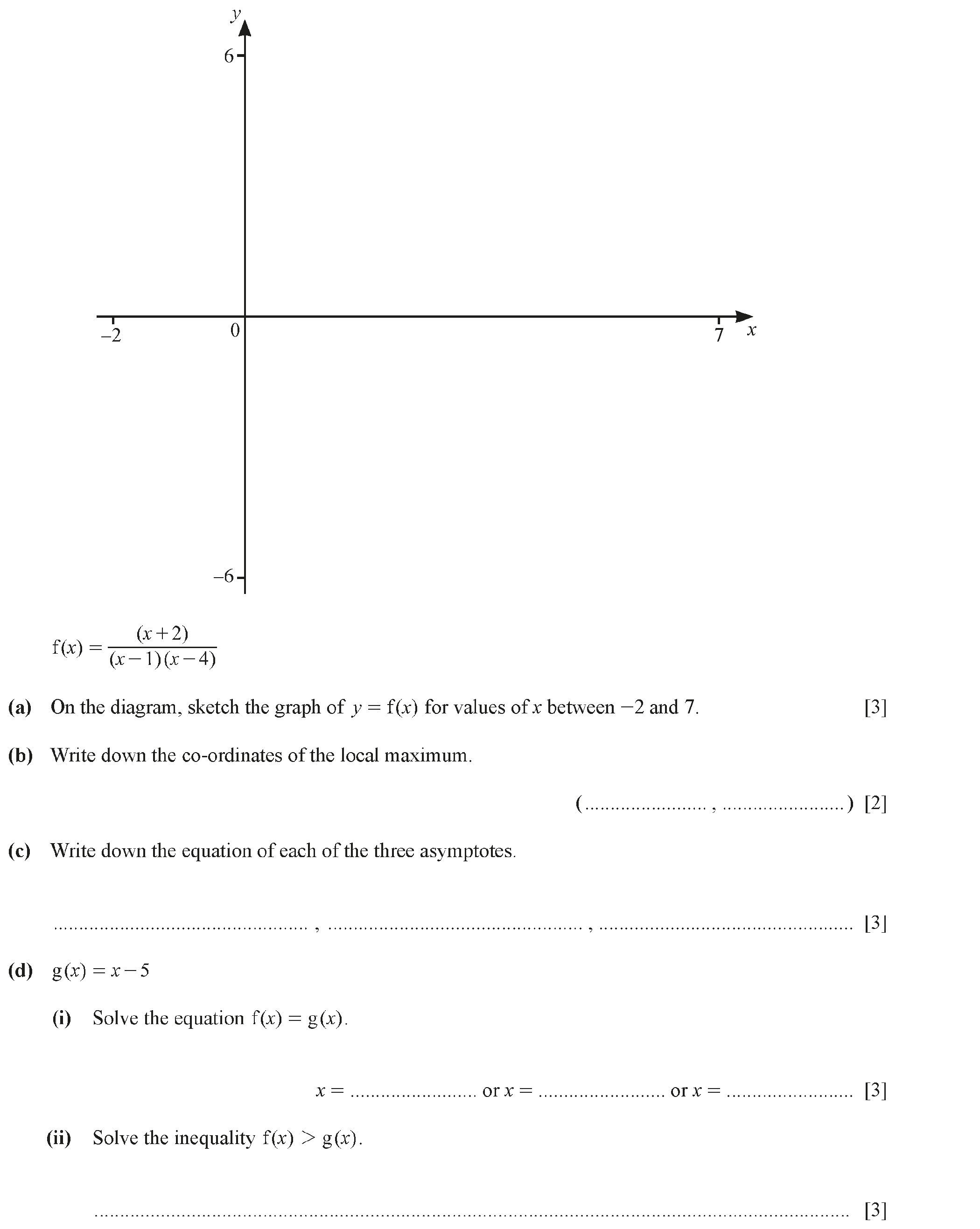 (a) On the diagram, sketch the graph of $y = f(x)$ for values of $x$ between $-6$ and $6$. [3](b) Write down the equations of the asymptotes of the gr...