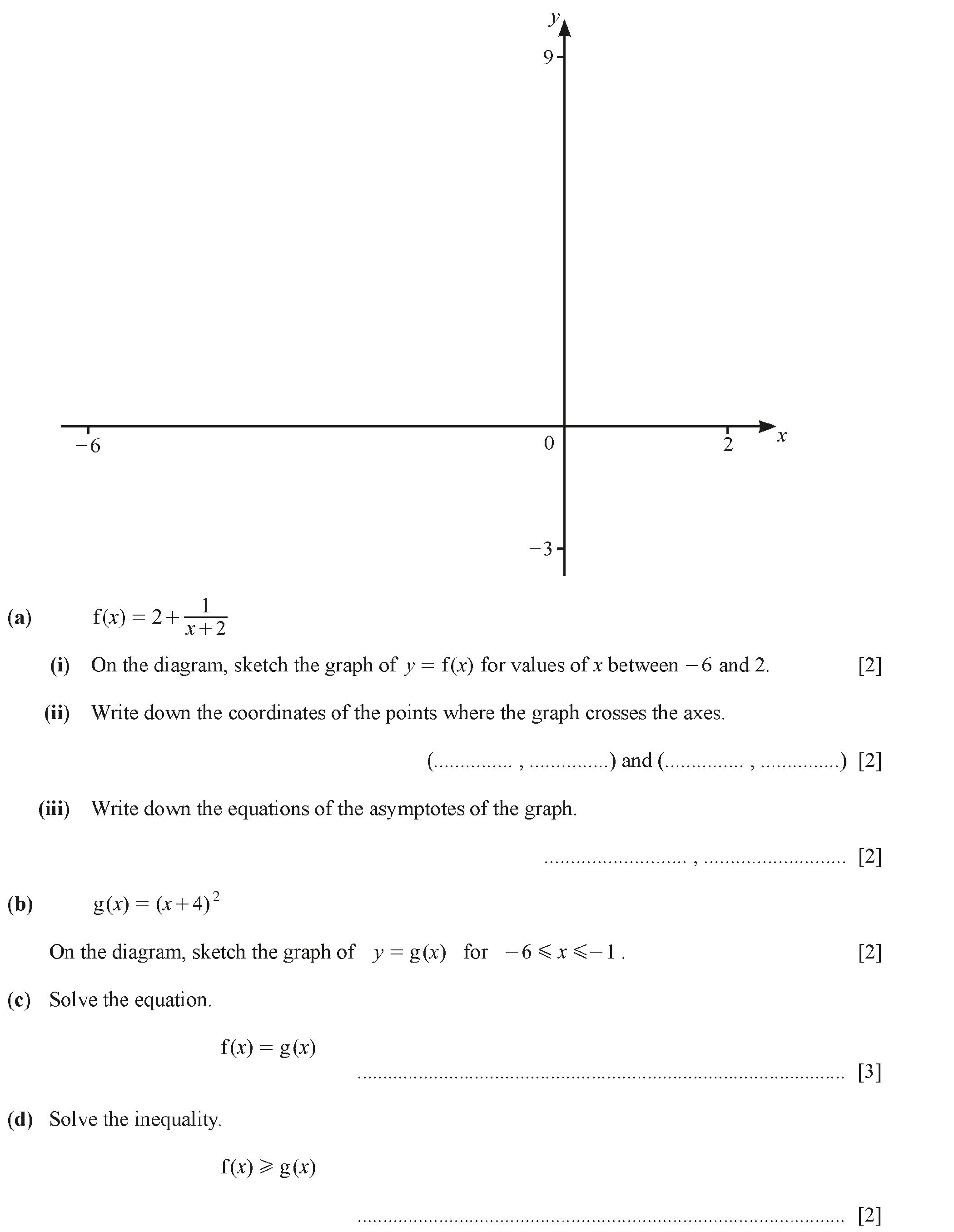 (a) On the diagram, sketch the graph of $y = f(x)$ for values of $x$ between $-6$ and $6$. [3](b) Write down the equations of the asymptotes of the gr...