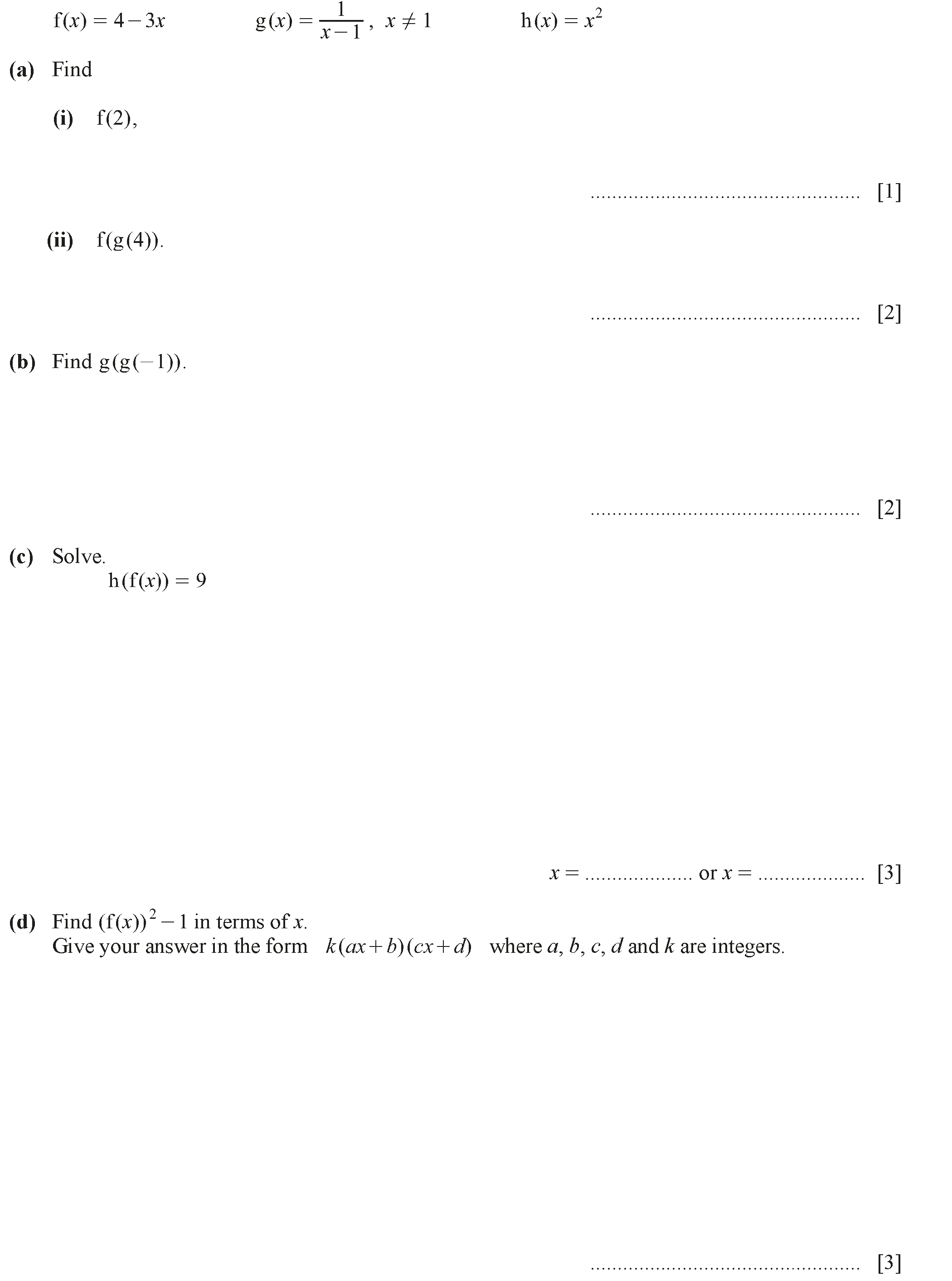 f(x) = 3x + 1 \hspace{1cm} g(x) = \log x (a) Find the value of g(f(33)). ............................................... [2] (b) Find the value of x...