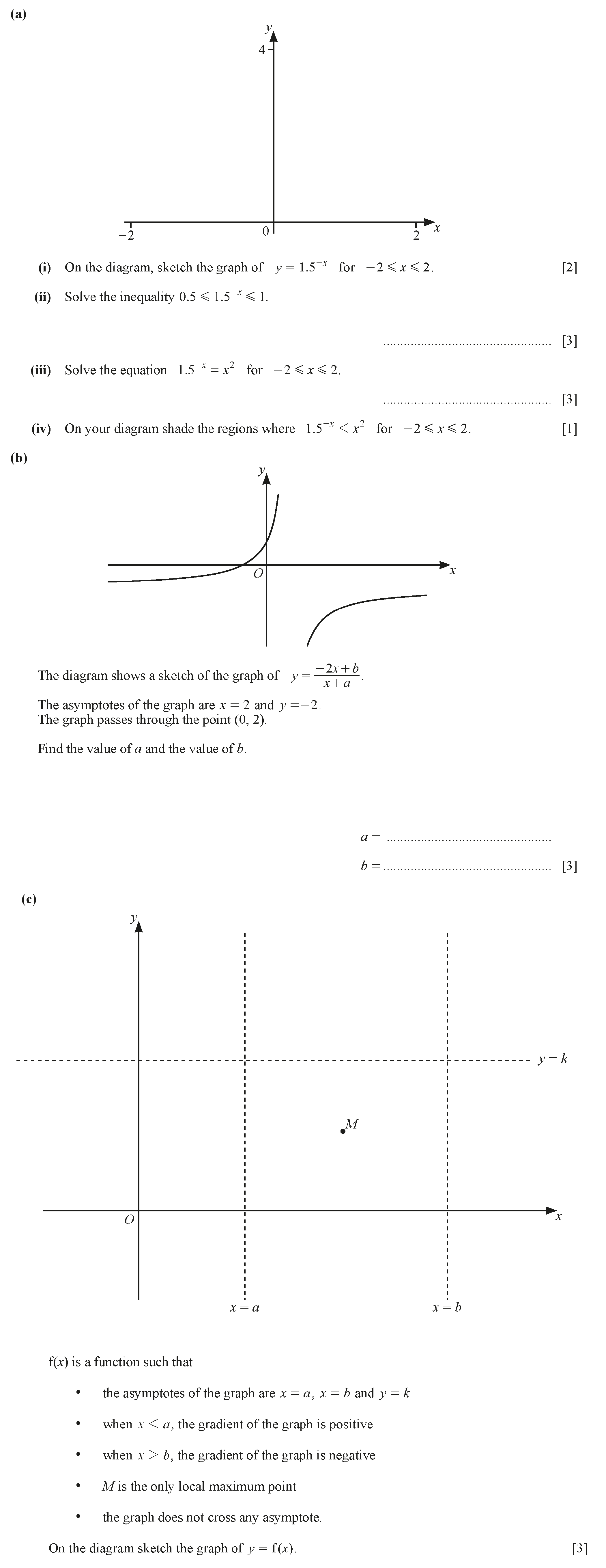 (a) On the diagram, sketch the graph of $y = f(x)$ for values of $x$ between $-6$ and $6$. [3](b) Write down the equations of the asymptotes of the gr...