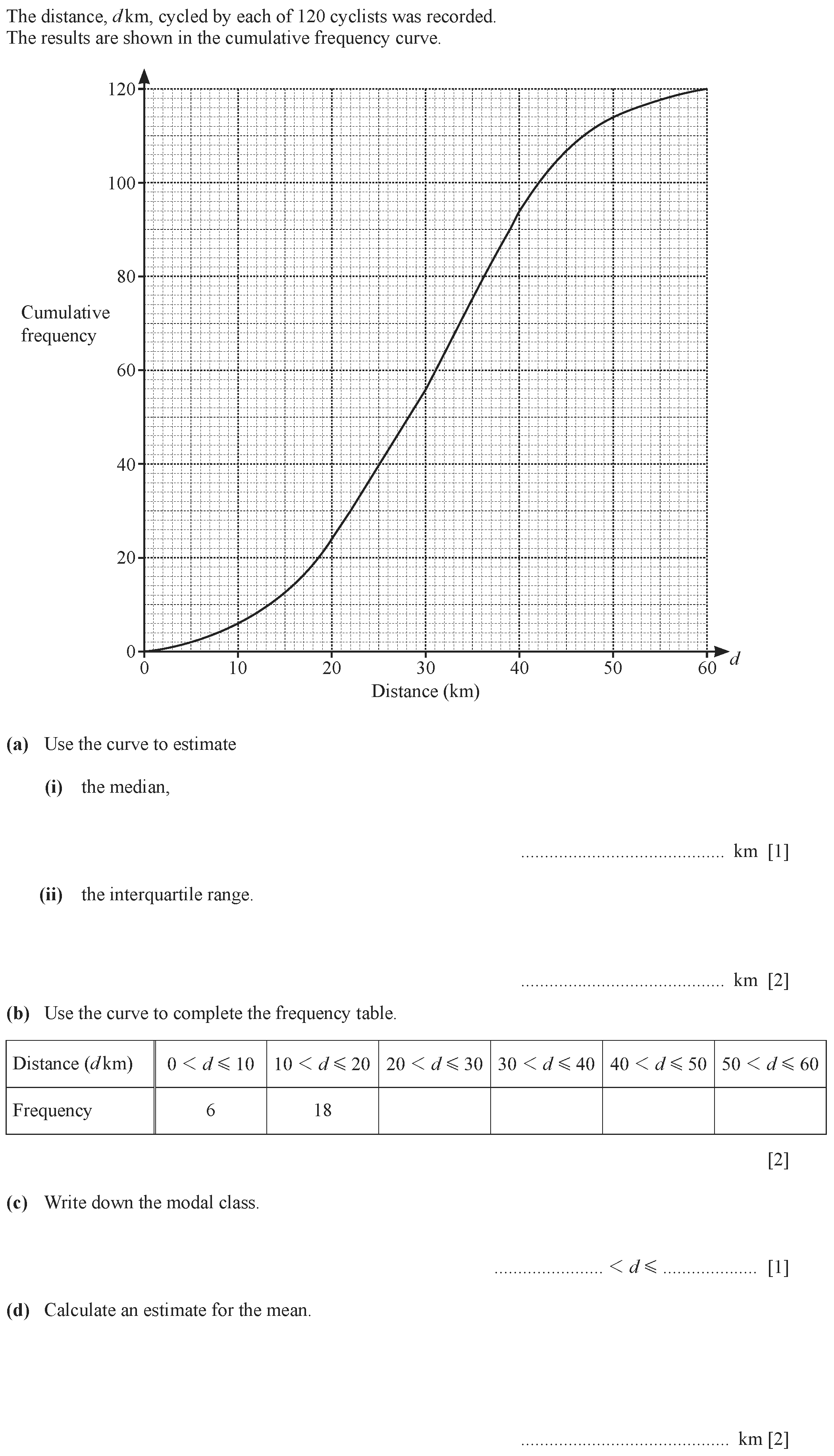 The age, $h$, of each of 120 passengers travelling on a train are shown in the table.[Table_1](a) Calculate an estimate of the mean age of a passenger...