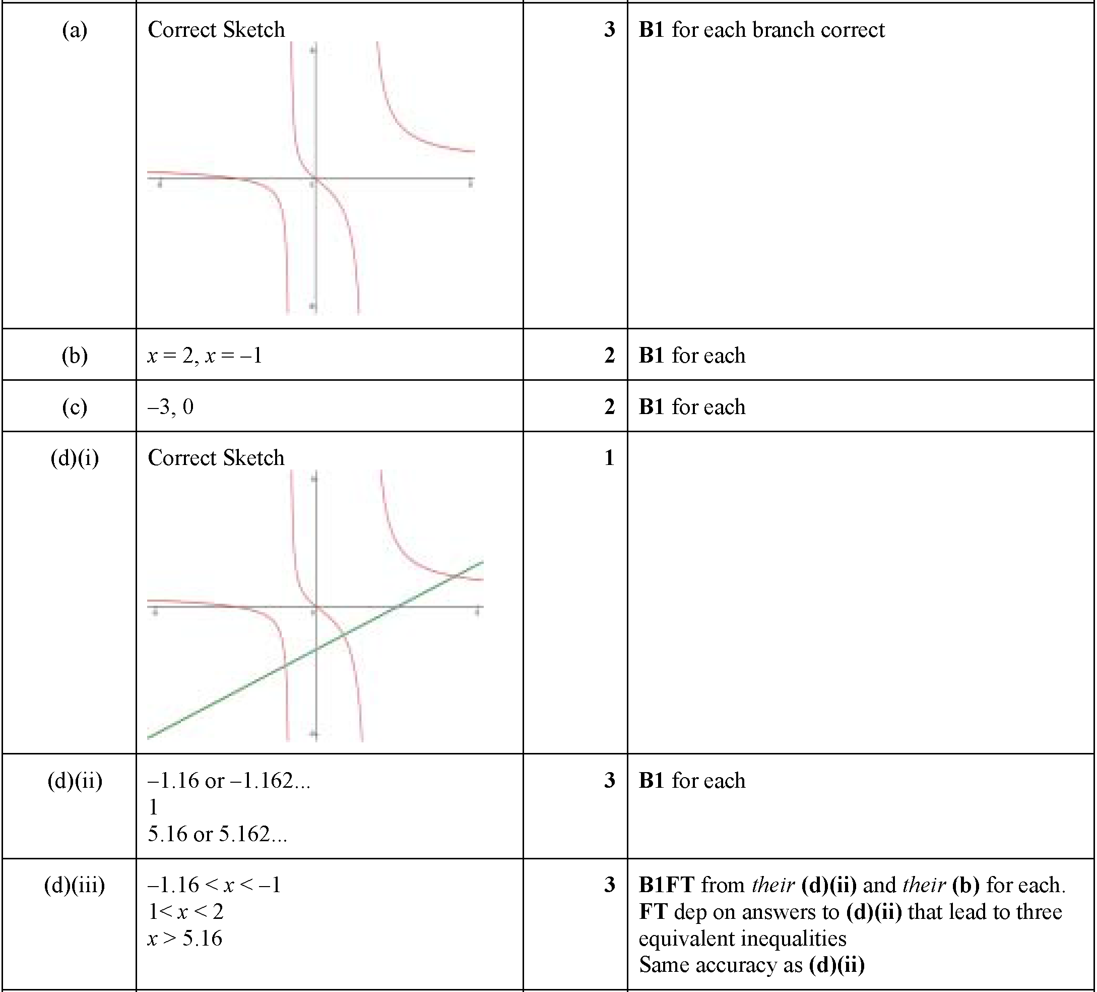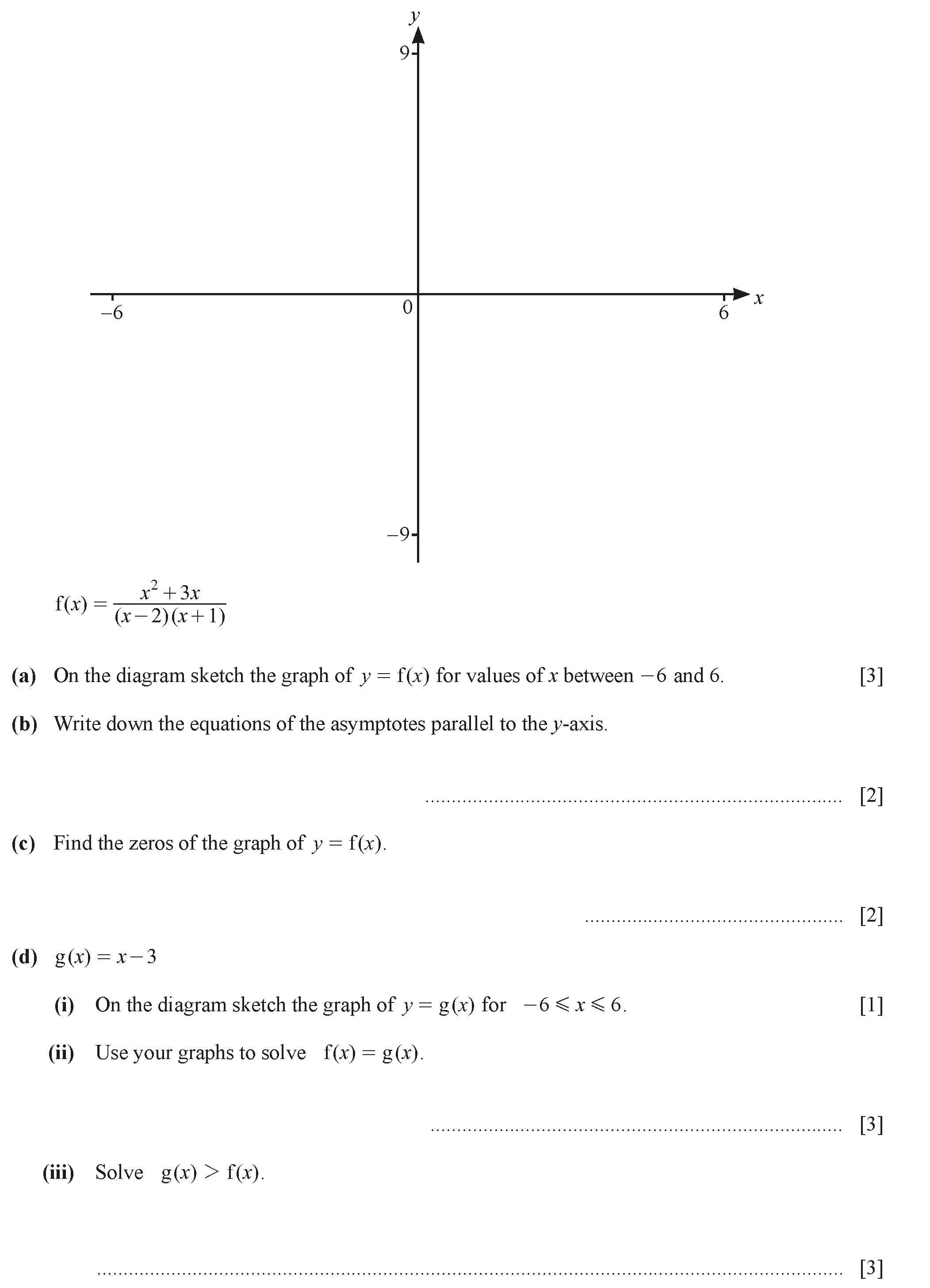(a) On the diagram, sketch the graph of $y = f(x)$ for values of $x$ between $-6$ and $6$. [3](b) Write down the equations of the asymptotes of the gr...