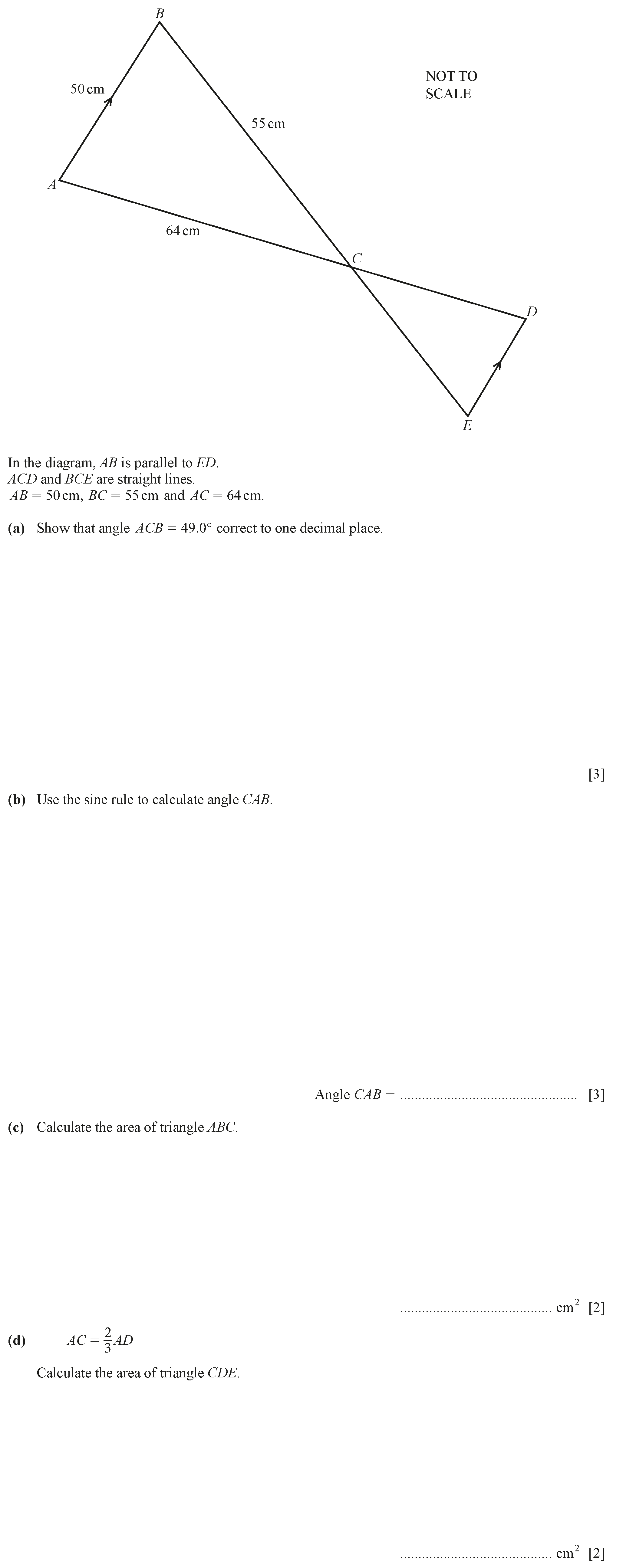 Calculate (a) $BC$, Answer(a) ............................................................. cm [2] (b) angle $CAD$, Answer(b) .......................