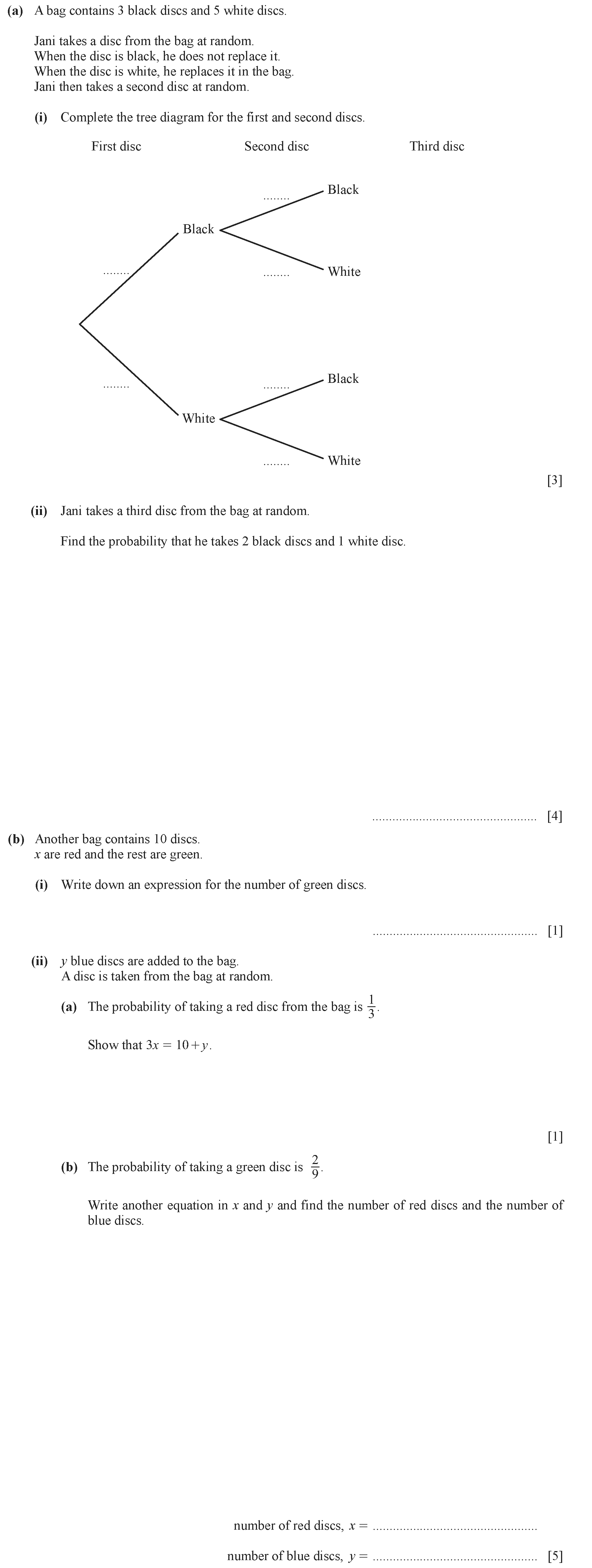 A bag contains 10 discs. 5 discs are red, 4 are blue and 1 is green. A disc is chosen at random and not replaced. A second disc is then chosen at rand...