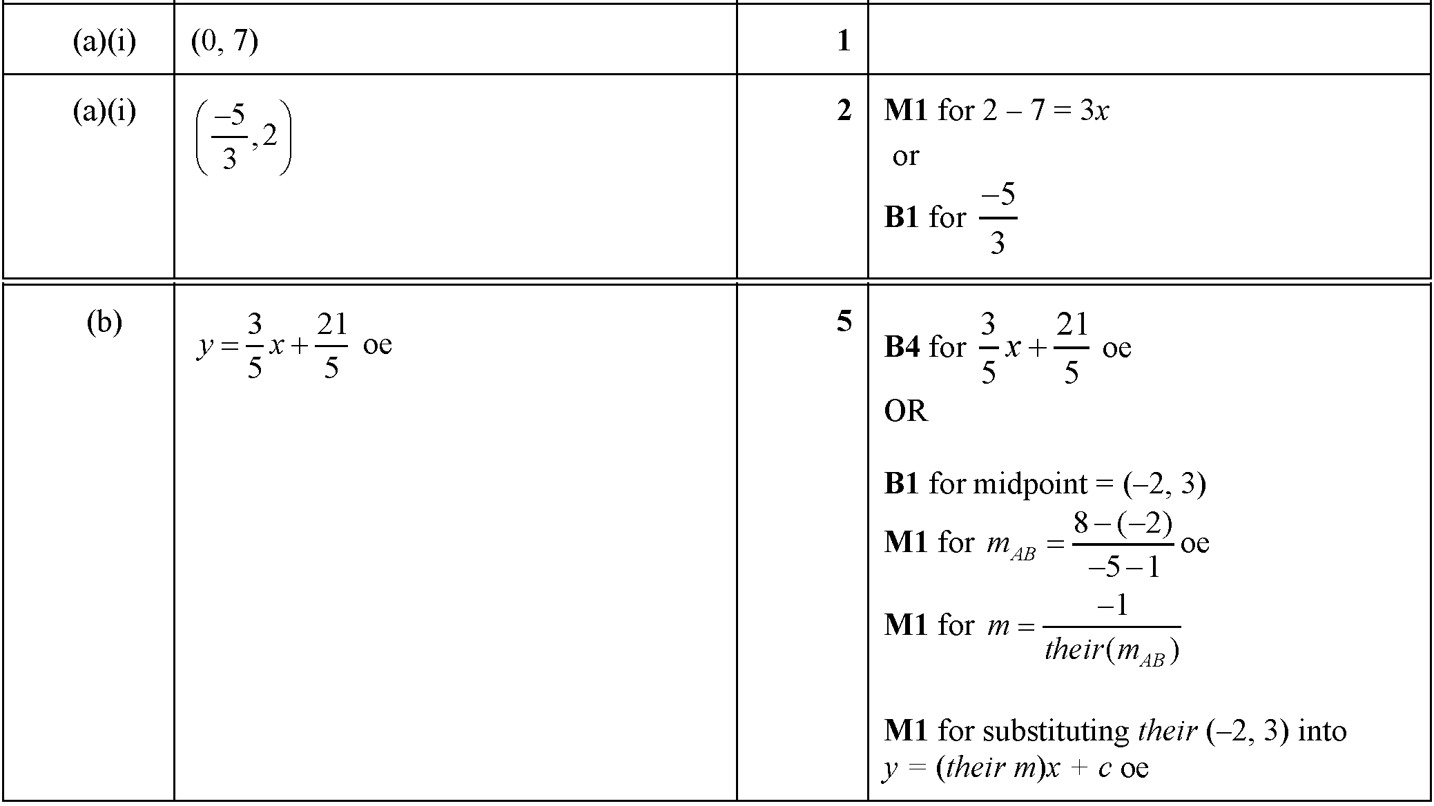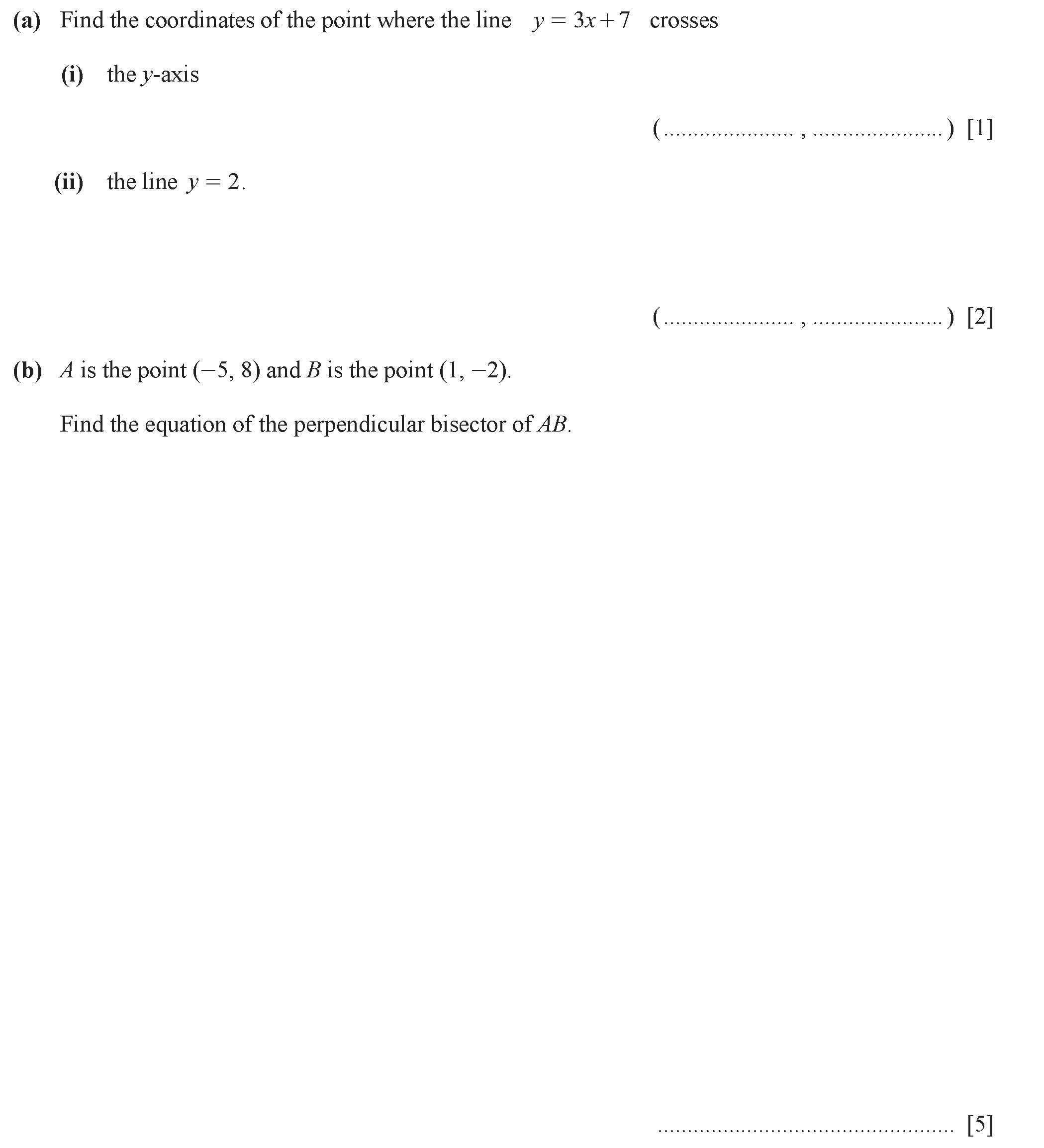 A is the point (0, 6) and B is the point (4, 0).(a) Find the equation of the perpendicular bisector of $AB$. [5](b) The line $y = 2x + 3$ cuts the $y$...