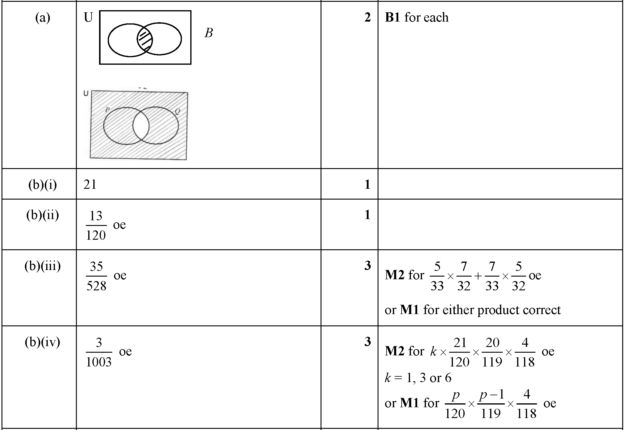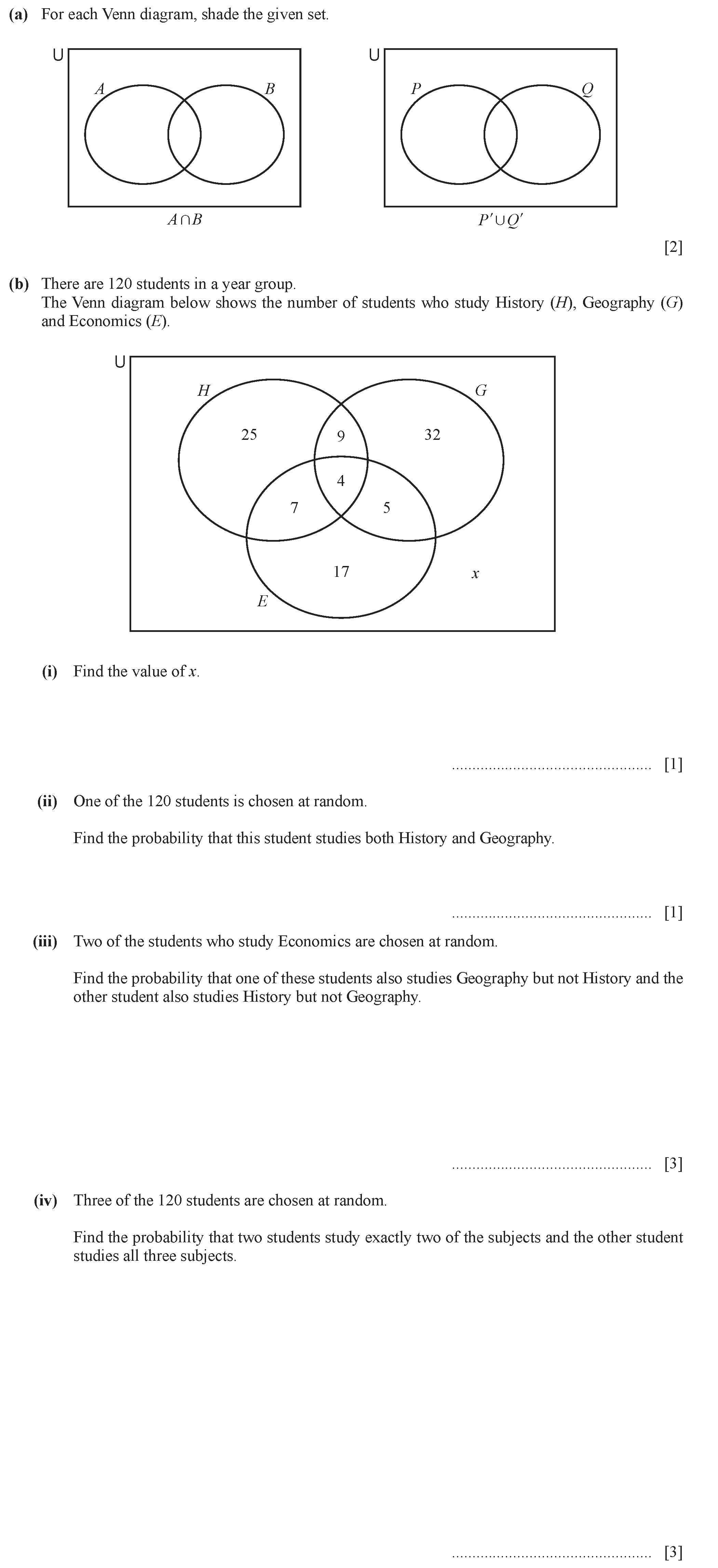 (a) Show that $n(P \cap Q) = 8$. [2](b) An element is chosen at random from $U$.Find the probability that the element is a member of(i) $P \cup Q$. .....