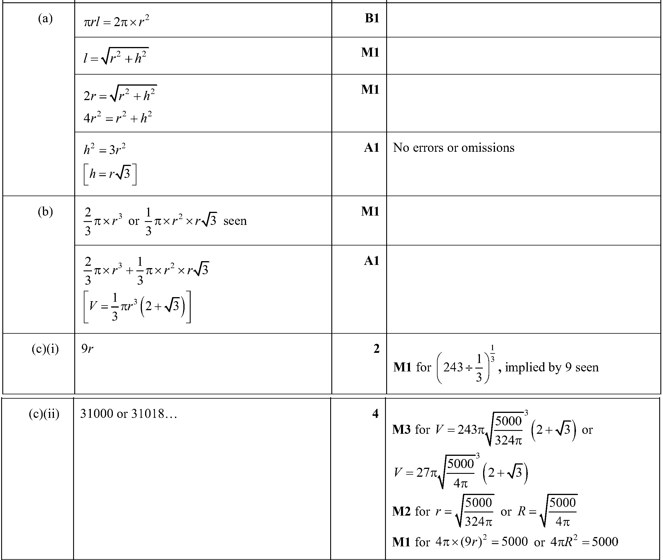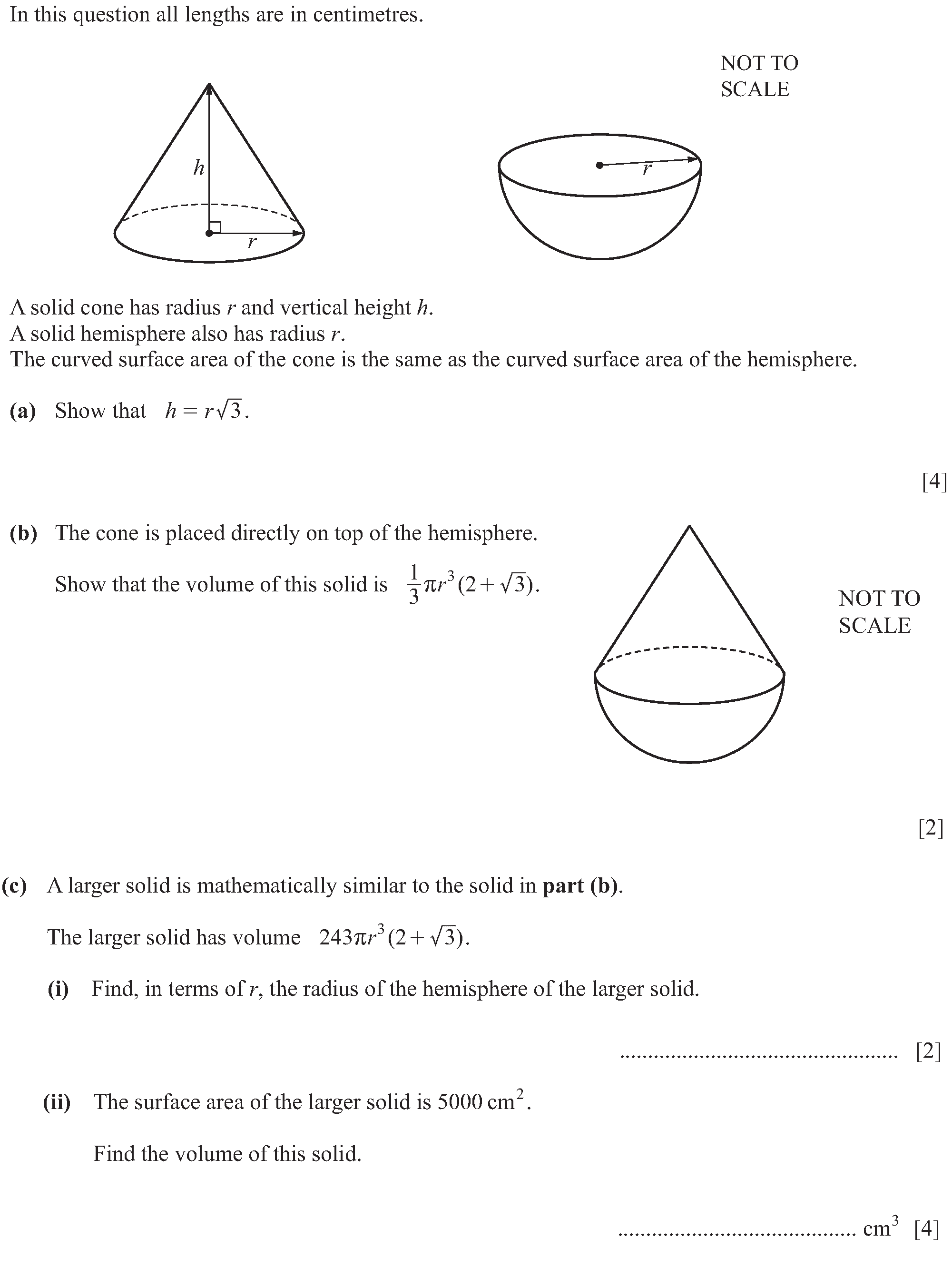 In this question all lengths are in centimetres.A solid cone has radius $r$ and vertical height $h$.A solid hemisphere also has radius $r$.The curved ...