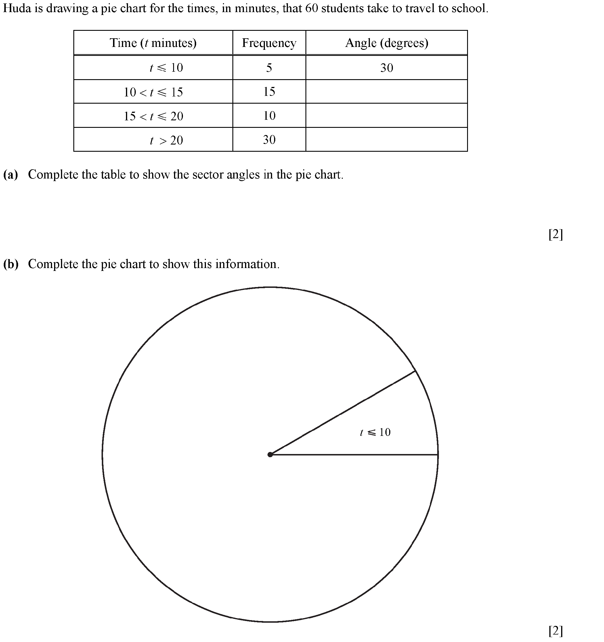 Huda is drawing a pie chart for the times, in minutes, that 60 students take to travel to school.[Table_1]Time \((t\text{ minutes})\) | Frequency | An...