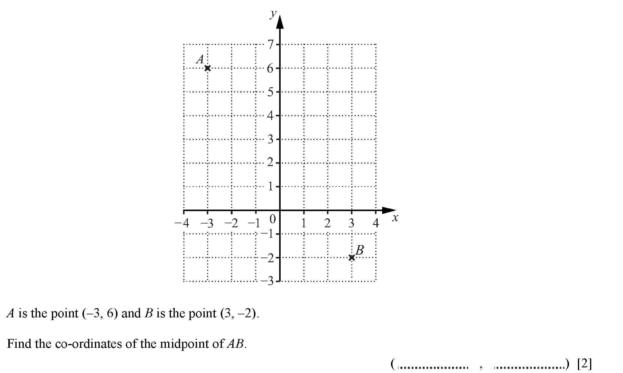 The axes are drawn on a 1 cm\(^2\) grid. A is the point (2, 3) and B is the point (8, -3). (a) Plot the points A and B on the grid. [2] (b) Find the c...