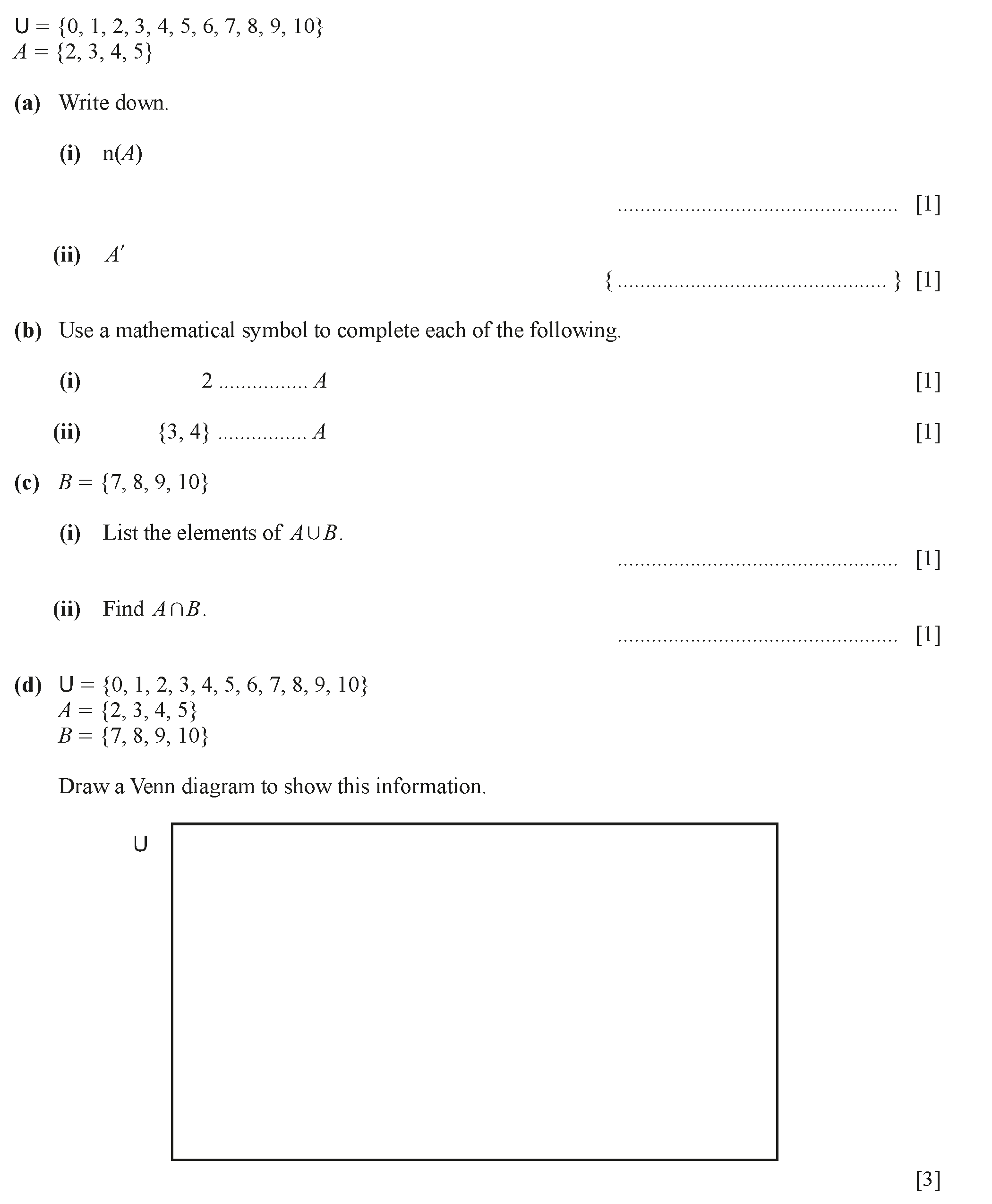 List the elements in each of the following sets.(a) (i) $A$Answer(a)(i) ................................................................. [1](ii) $A \...