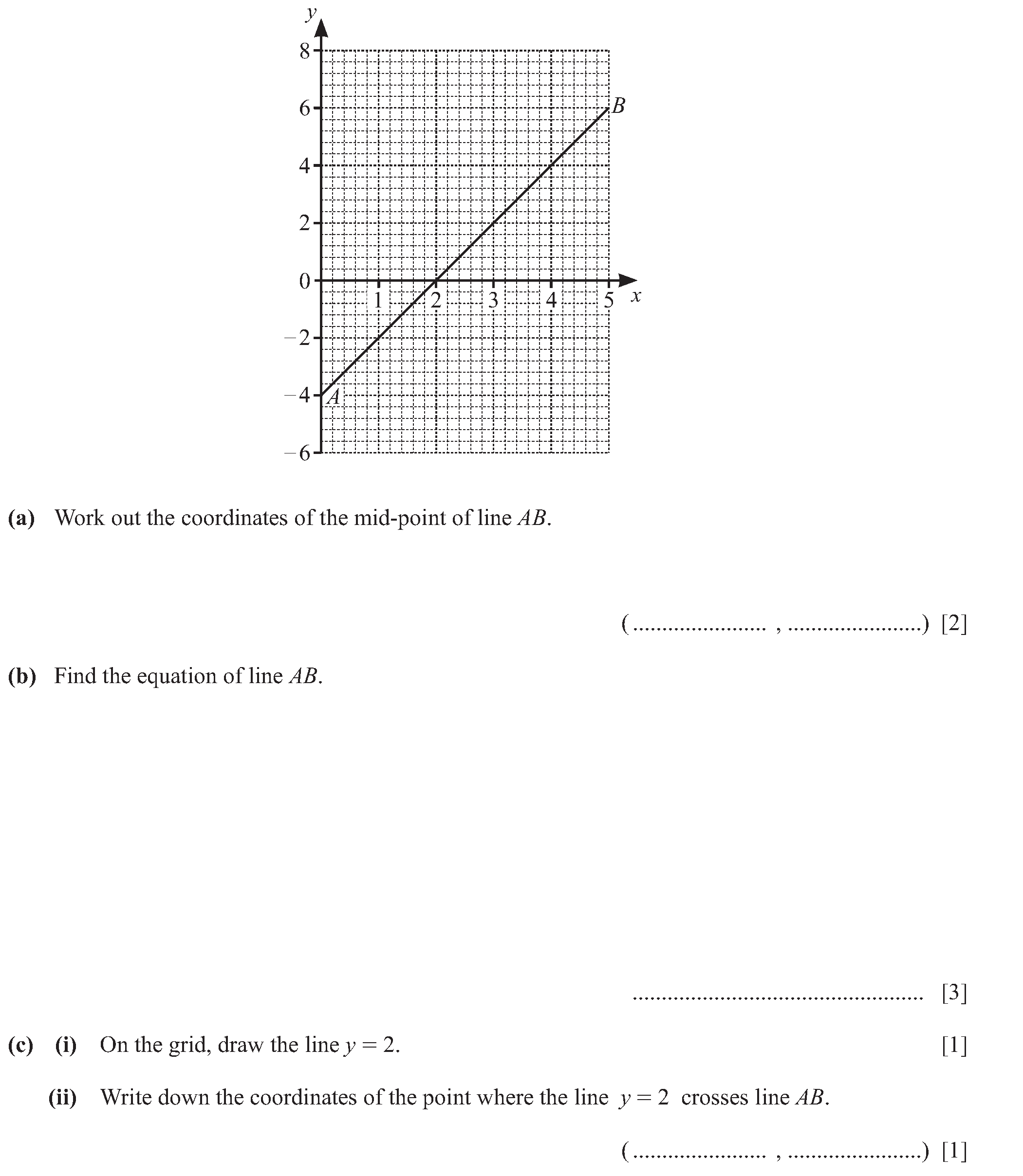 (a) On the grid, plot the points $A(-3, 3)$ and $B(5, -3)$. (b) Find the gradient of the line $AB$. Answer(b) ................................. [2]