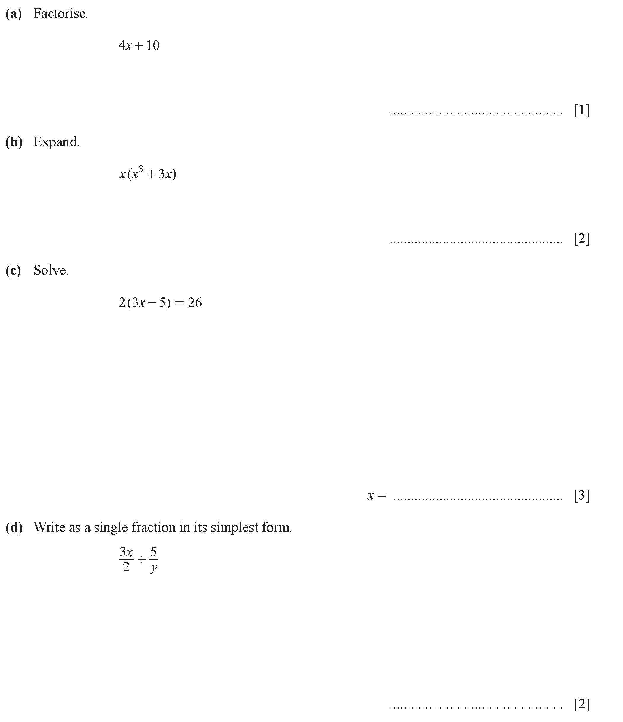 (a) Simplify.(i) $3x - 5 + 2x - 12$Answer(a)(i) ..................................................... [2](ii) $4 \times d \times 2 \times d$Answer(a)(...