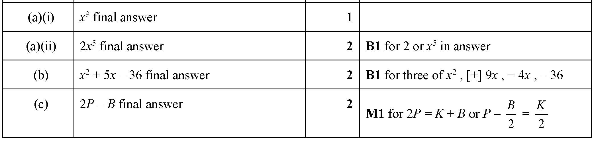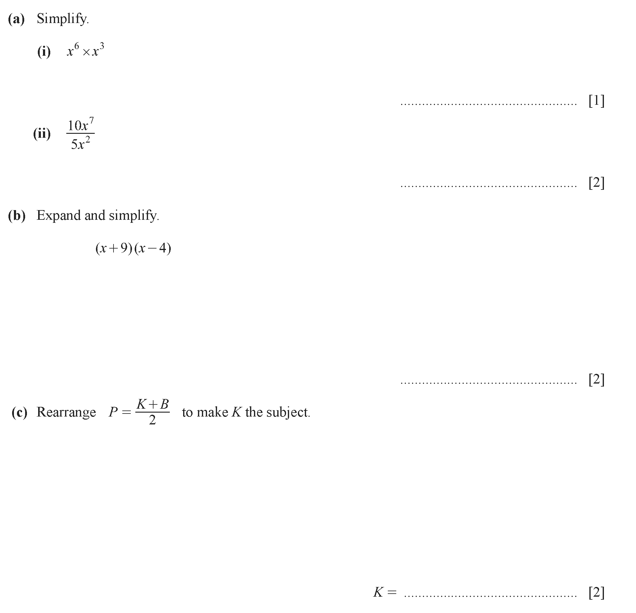 (a) Simplify.(i) $3x - 5 + 2x - 12$Answer(a)(i) ..................................................... [2](ii) $4 \times d \times 2 \times d$Answer(a)(...