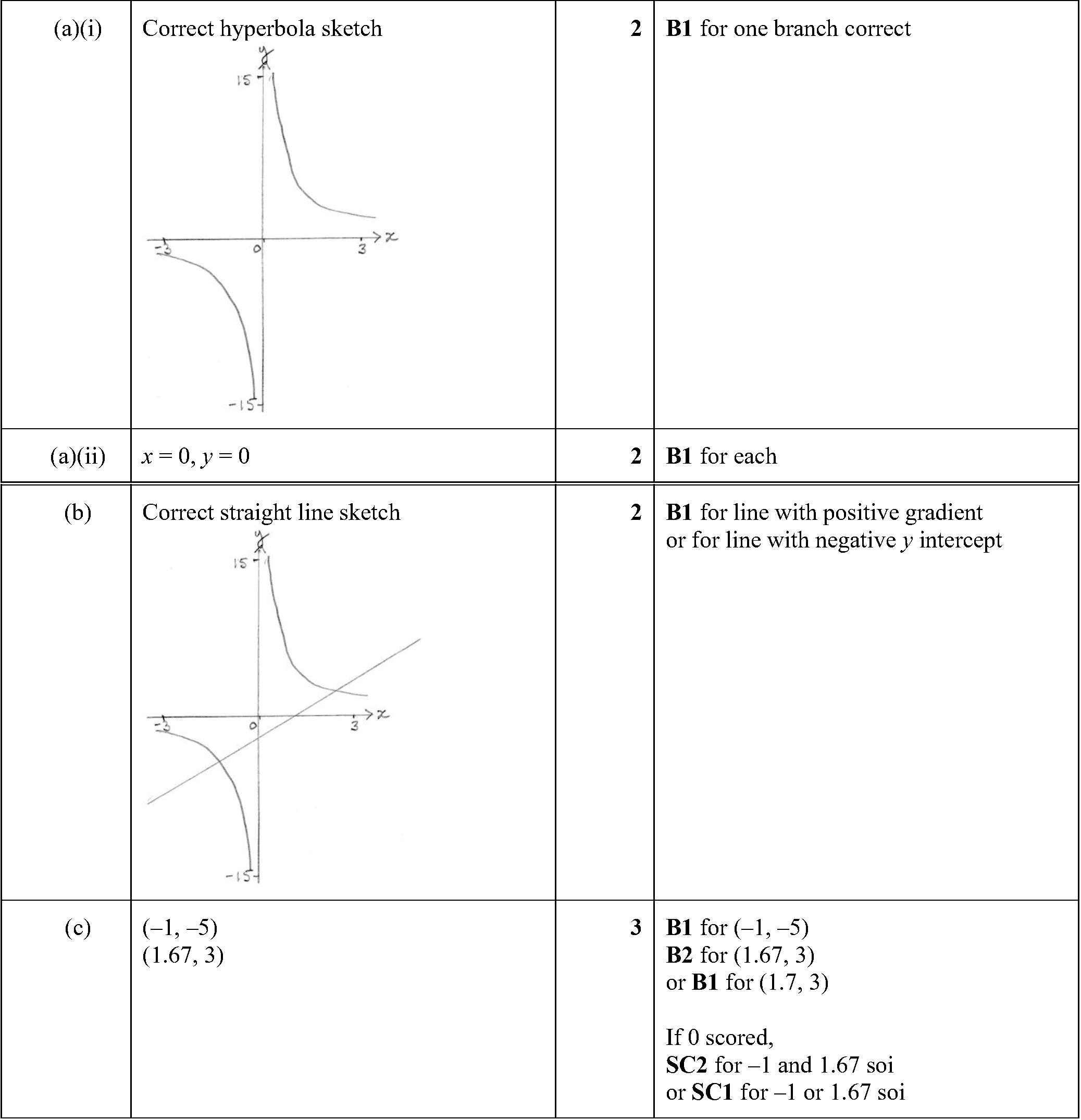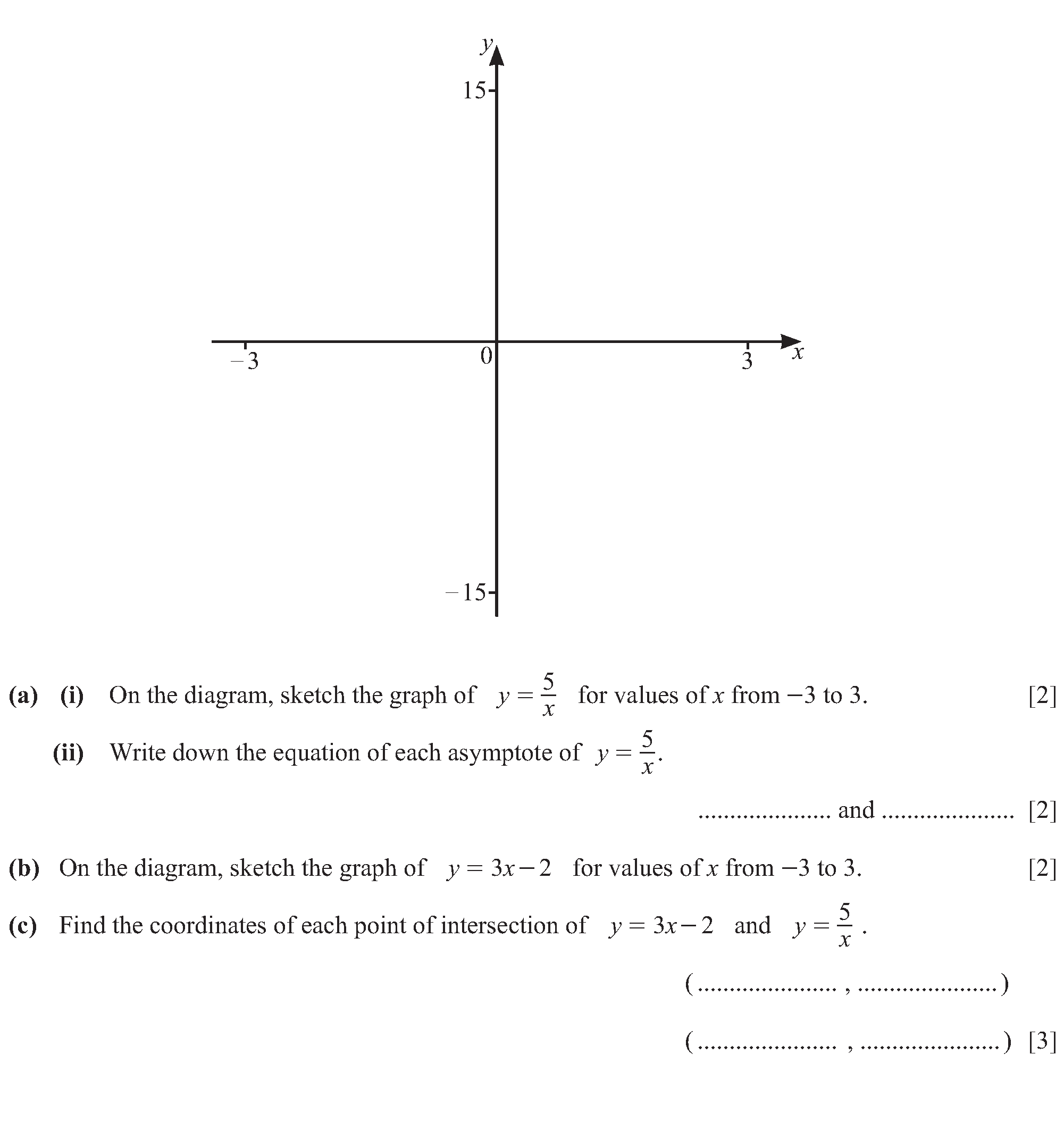 (a) (i) On the diagram, sketch the graph of $y = \frac{5}{x}$ for values of $x$ from $-3$ to $3$. [2] (ii) Write down the equation of each asymptote ...