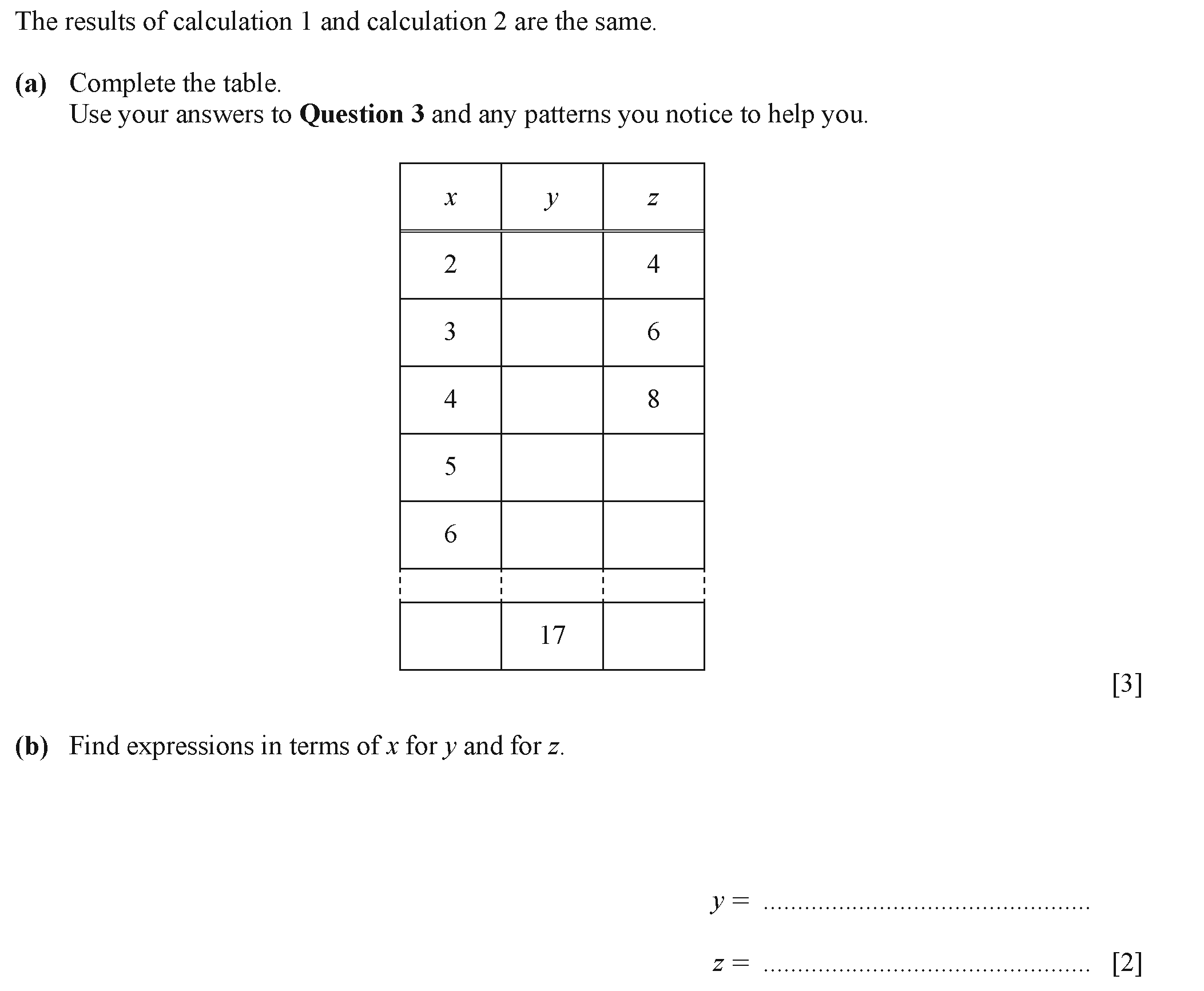 In this question $x$ and $z$ do not change in each part.(a) In this part $x = 2$ and $z = 4$.Complete the table.| | | | Calculation ...