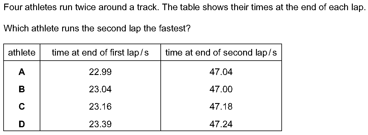 A student uses a stopwatch to time a runner running around a circular track. The runner runs two laps (twice around the track). The diagrams show the ...