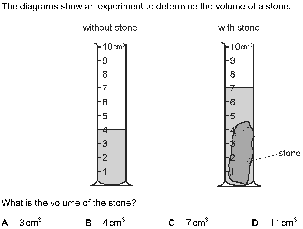 The volume of a stone is to be found using the equipment illustrated in Fig. 1.1. [Image_1: Fig. 1.1 showing a stone, measuring cylinder, and water] T...
