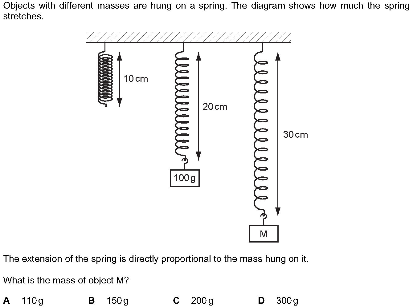 Objects with different masses are hung on a spring. The diagram shows how much the spring stretches. The extension of the spring is directly propor...