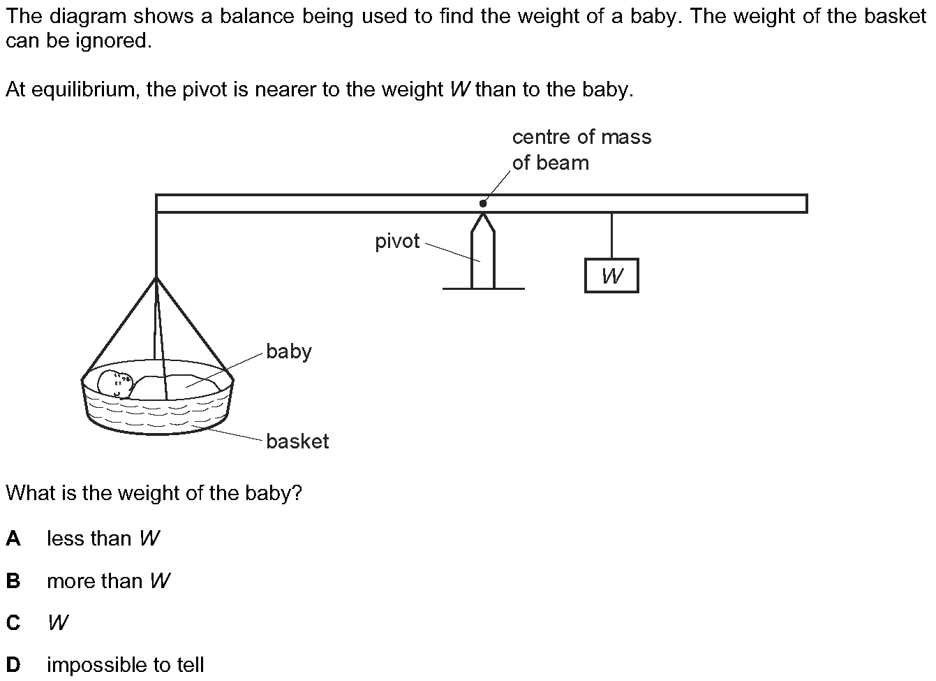 The diagram shows a balance being used to find the weight of a baby. The weight of the basket can be ignored.At equilibrium, the pivot is nearer to th...