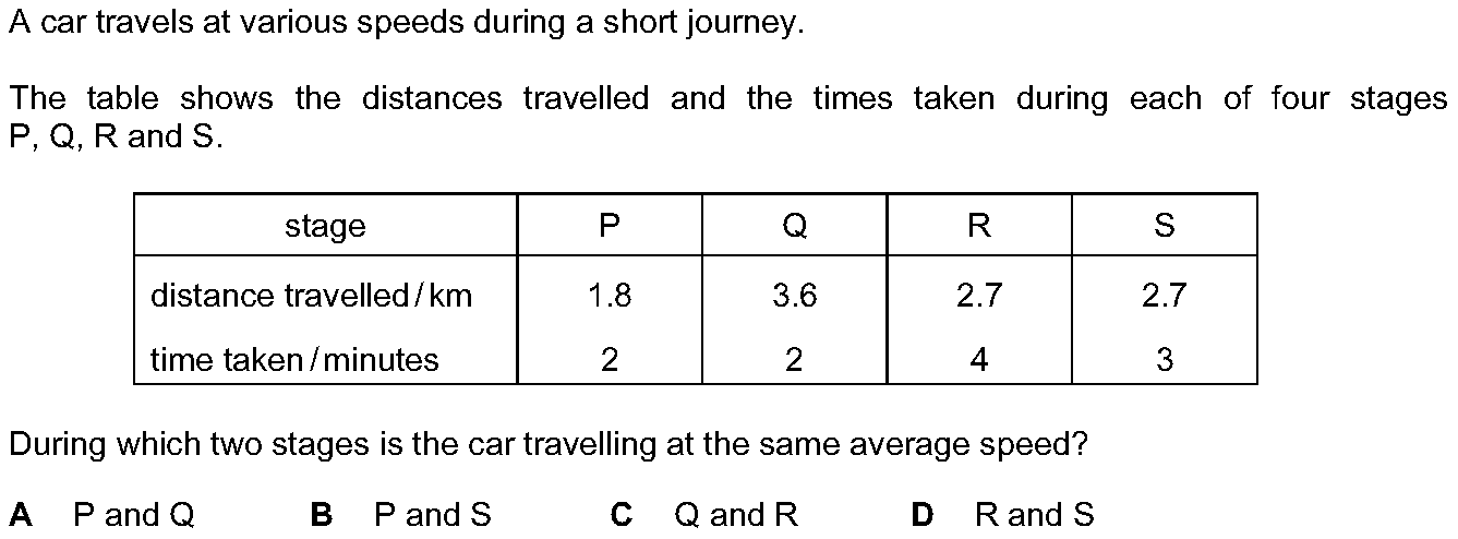 A car travels at various speeds during a short journey. The table shows the distances travelled and the times taken during each of four stages P, Q, R...
