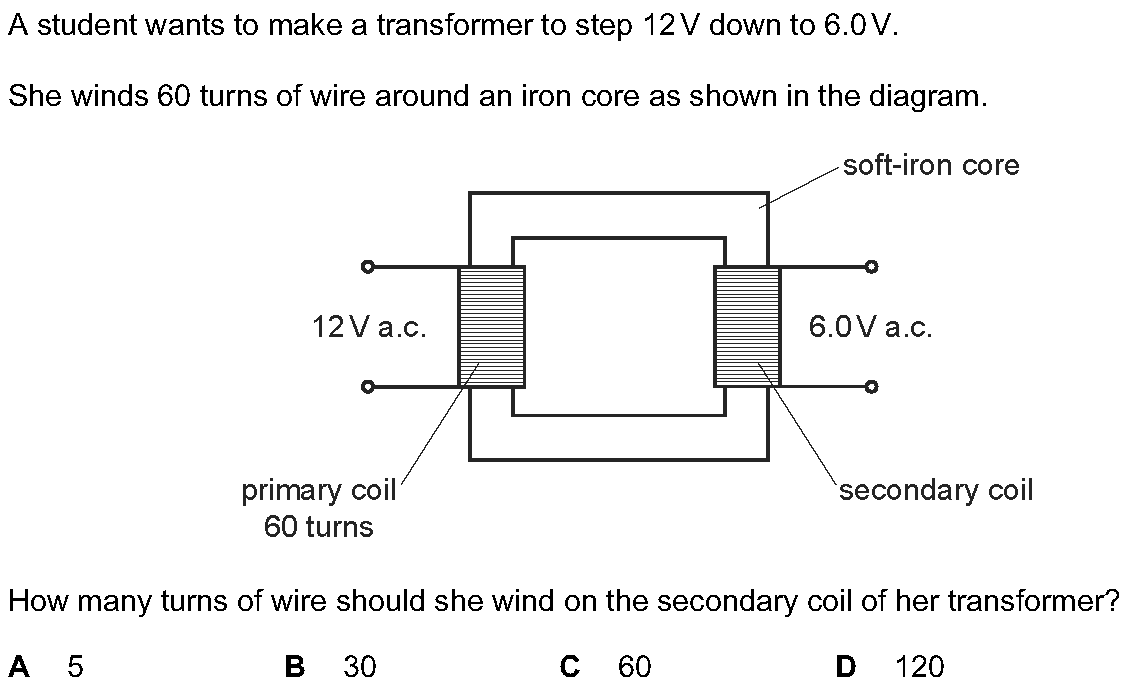 A 240V a.c. mains supply is connected to the primary coil of the transformer shown in Fig. 10.1. A lamp that gives full brightness with a 6V supply is...