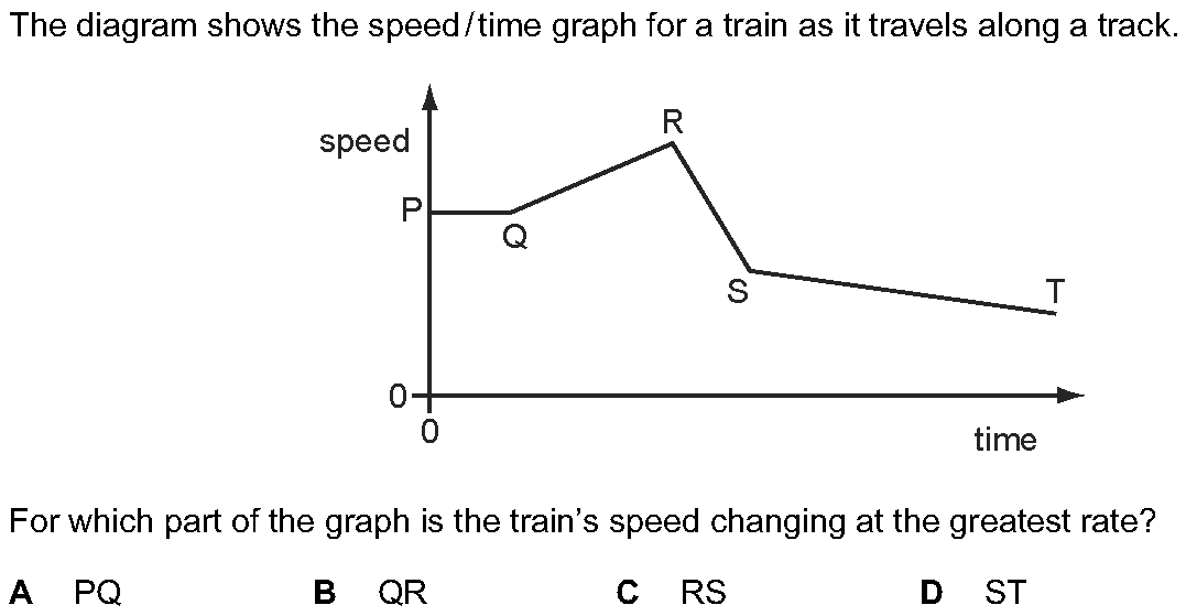 A car travels at various speeds during a short journey. The table shows the distances travelled and the times taken during each of four stages P, Q, R...