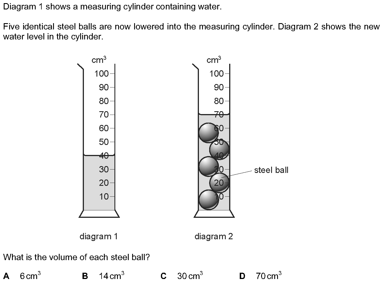 The volume of a stone is to be found using the equipment illustrated in Fig. 1.1. [Image_1: Fig. 1.1 showing a stone, measuring cylinder, and water] T...