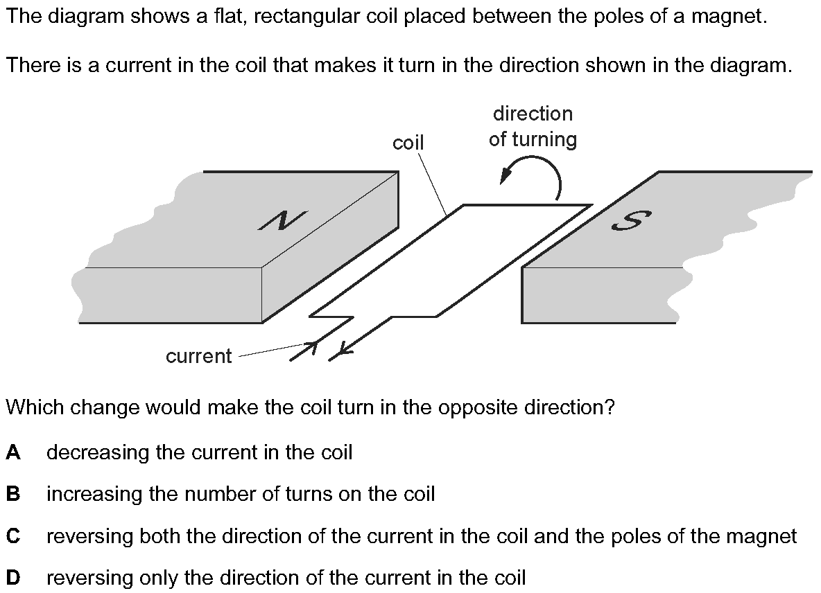 The coil in the d.c. motor in Fig. 9.1 is rotating as shown. (a) On Fig. 9.1, clearly label the coil. [1](b) State two things that could be done to th...