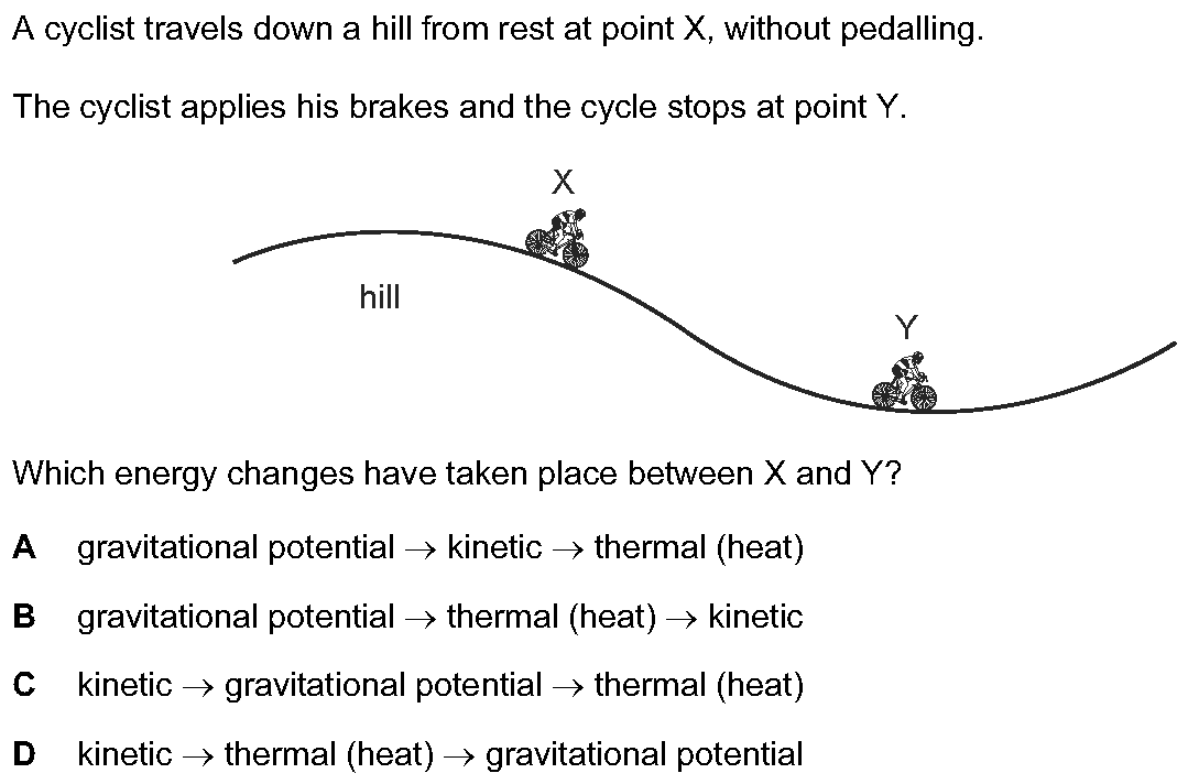 A cyclist travels down a hill from rest at point X, without pedalling. The cyclist applies his brakes and the cycle stops at point Y. Which energy c...