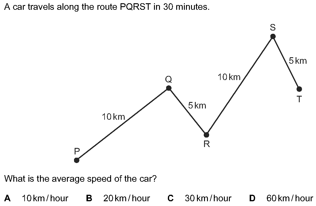 A car travels 100 km. The journey takes two hours. The highest speed of the car is 80 km/h, and the lowest speed is 40 km/h. What is the average speed...