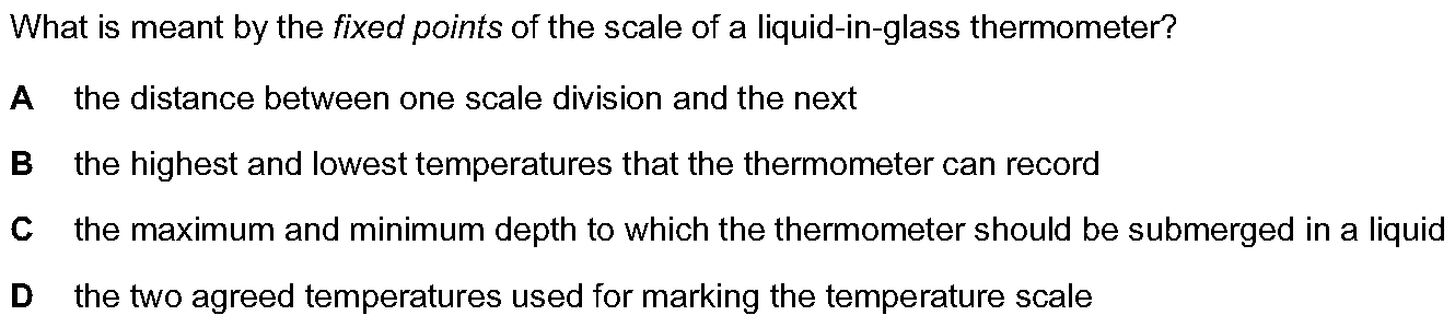 The liquid-in-glass thermometer in Fig. 6.1 has a scale from -10°C to 110°C.(a) Two of the temperatures marked on the thermometer are known as fixed...