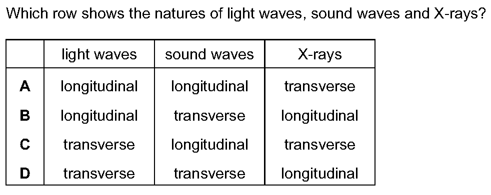 (a) The four words below can each be used to describe waves.Put a tick in each of the boxes alongside any words that can be applied to sound waves.lon...